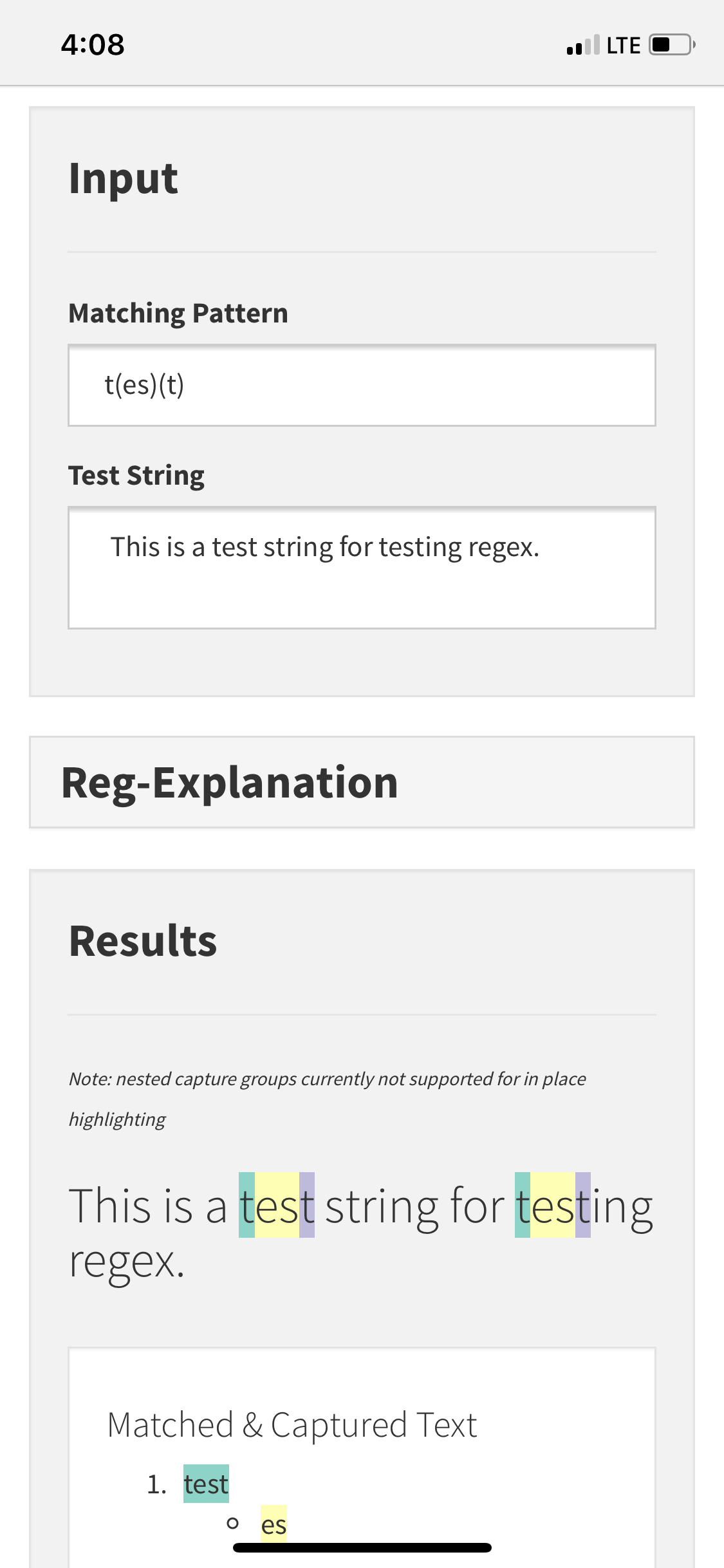- As noted in the UI, currently nested capture group highlighting isn't supported. If our matching pattern was "t(e(s))(t)" the highlighting wouldn't display correctly.