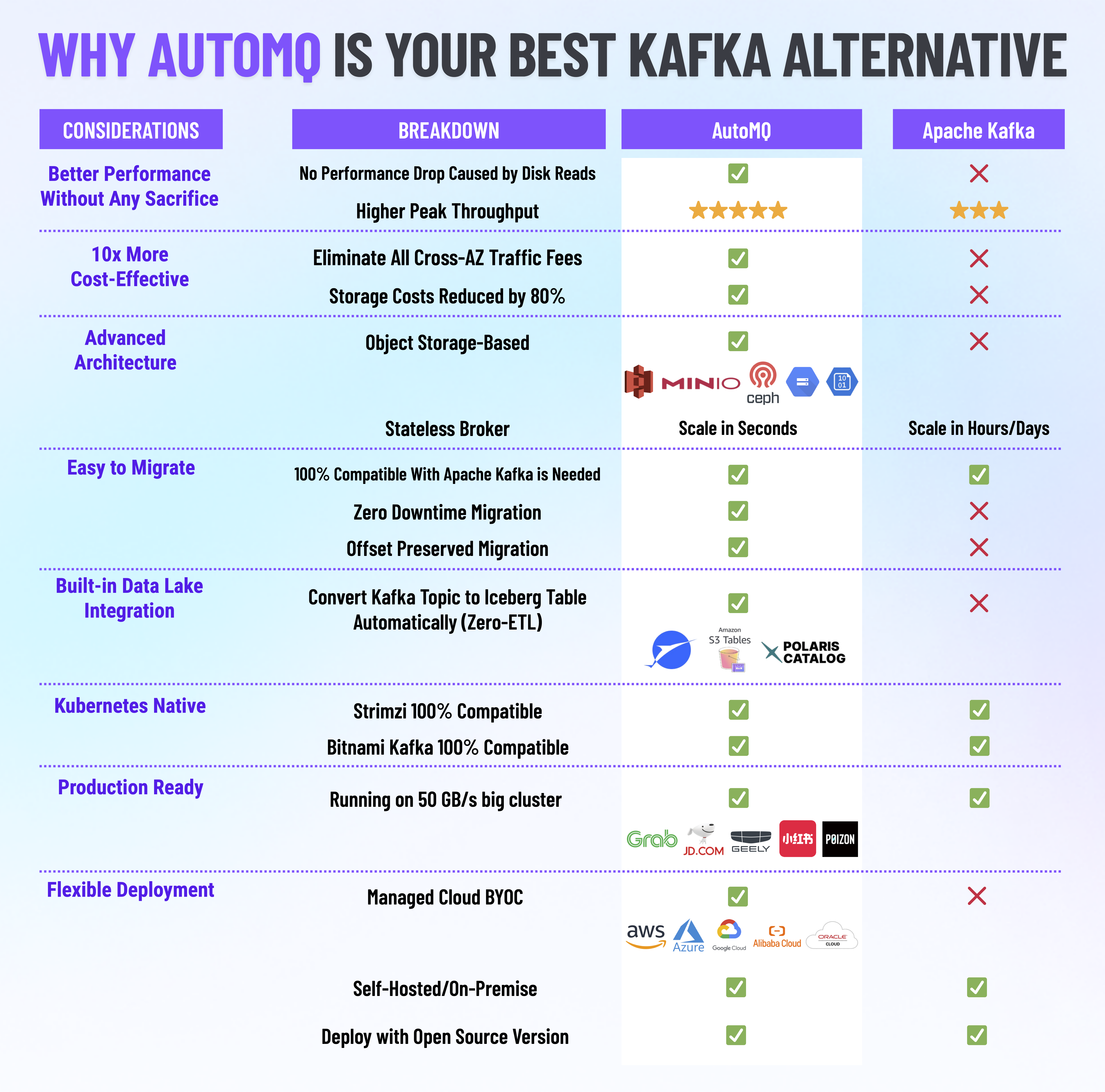 AutoMQ : Proven to handle 50 GB/s big clusters, trusted by major enterprises.
