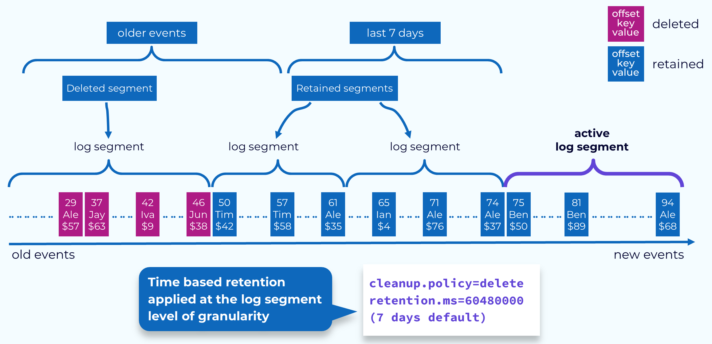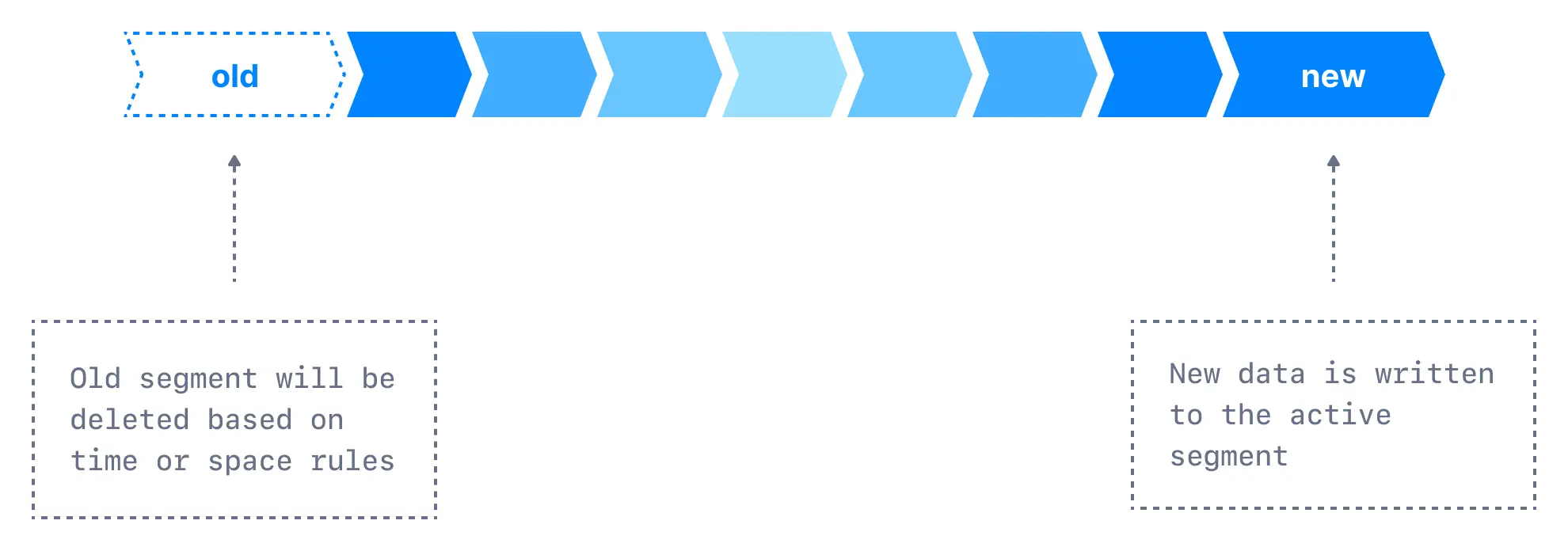 Delete Policy (default): Removes entire segments when they exceed the configured retention limits, either by time or size[1][8].