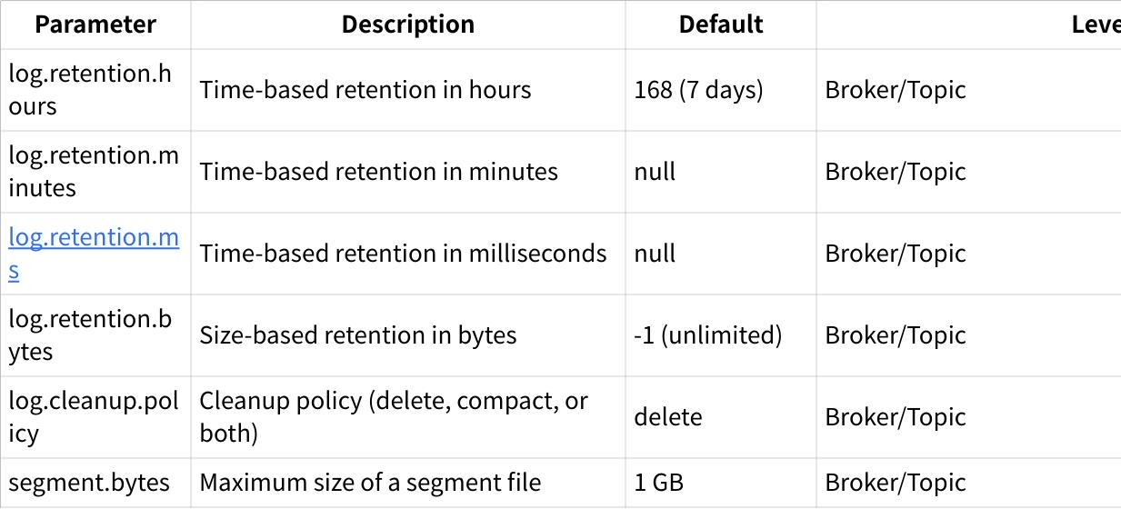 Kafka provides numerous configuration parameters to customize retention behavior at both the broker and topic levels.
