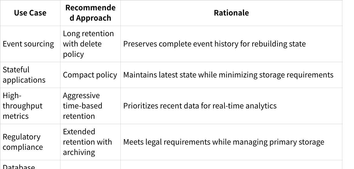 This retention mechanism is particularly beneficial for stateful applications, change data capture scenarios, and systems where the current state of data is more valuable than its complete history[2].