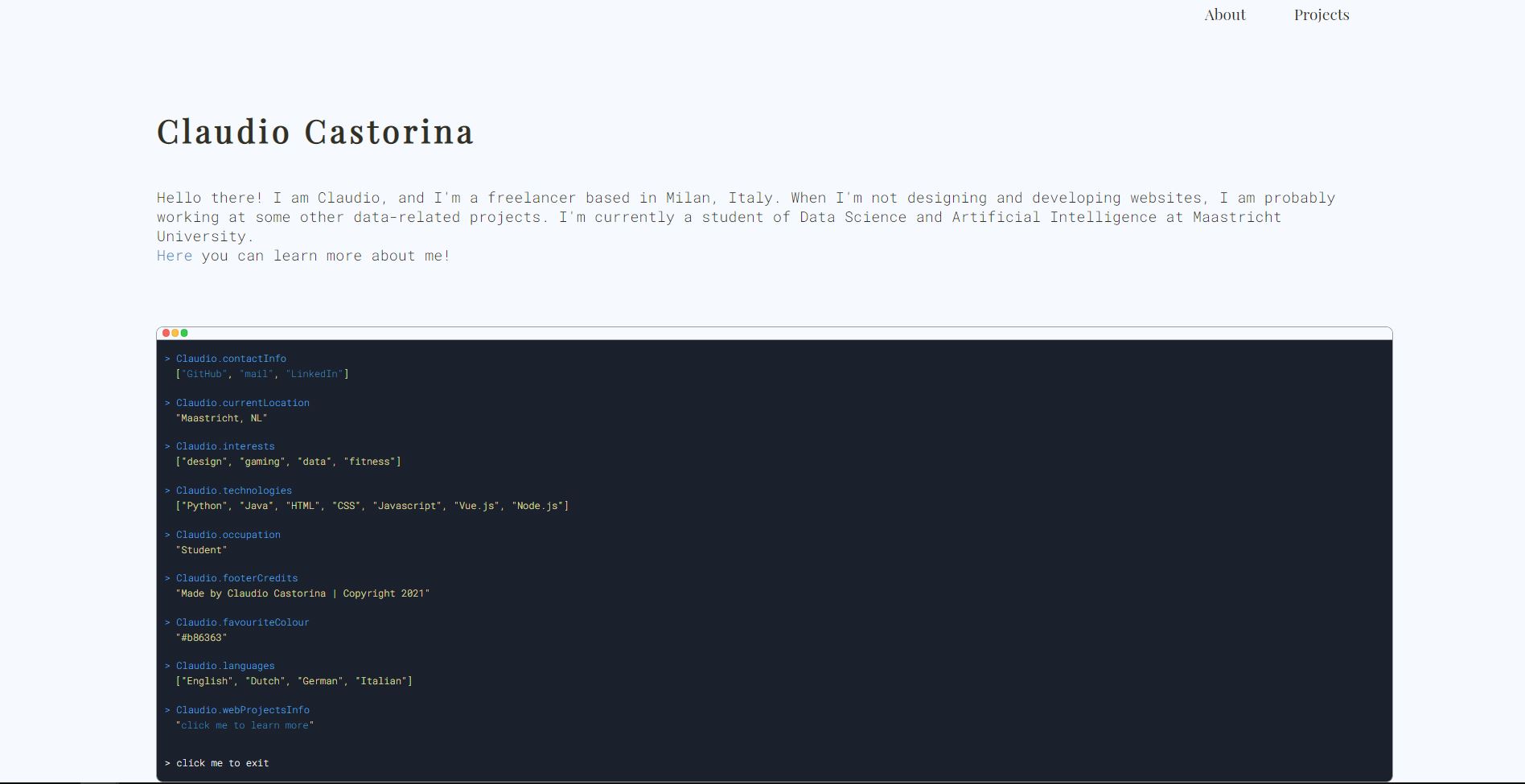 This component is more advanced than the previous ones. It is used to simulate the call of a property of a hypothetical object "Claudio" (me!), within a terminal created in CSS. Once this is done, all the data entered in App.vue is looped, and the possibility of going to the projects or closing the terminal is inserted.