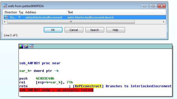 In the binary, you will see at address 0x40f031 an obfuscated call that was used by the packed binary which at runtime constituted a call to dynamically loaded code. However, this is not resolved by IDA pro when we load a given memory dump into the disassembler. The exact purpose of RePEconstruct is to automatically thwart self-modifying code and find calls like this.