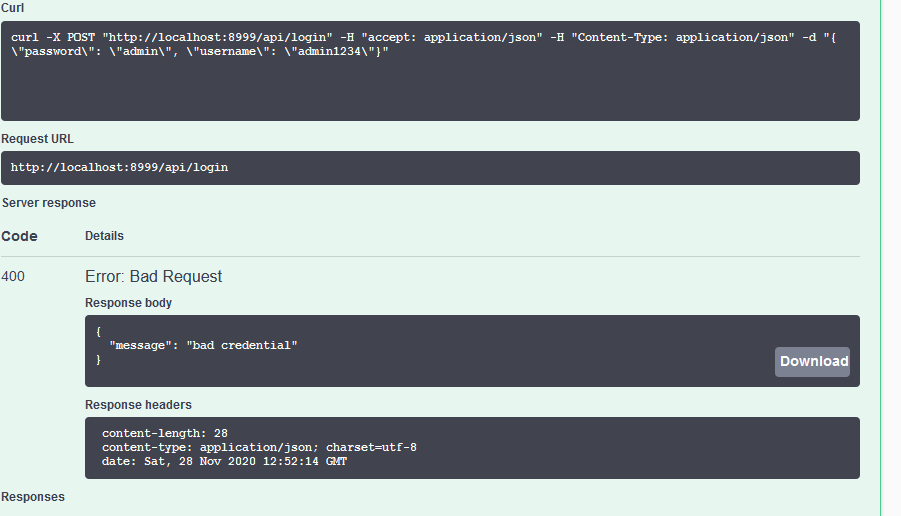If put wrong username or / and password,the API endpoit will give output something similiar to the following: