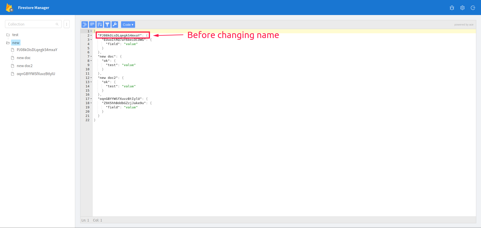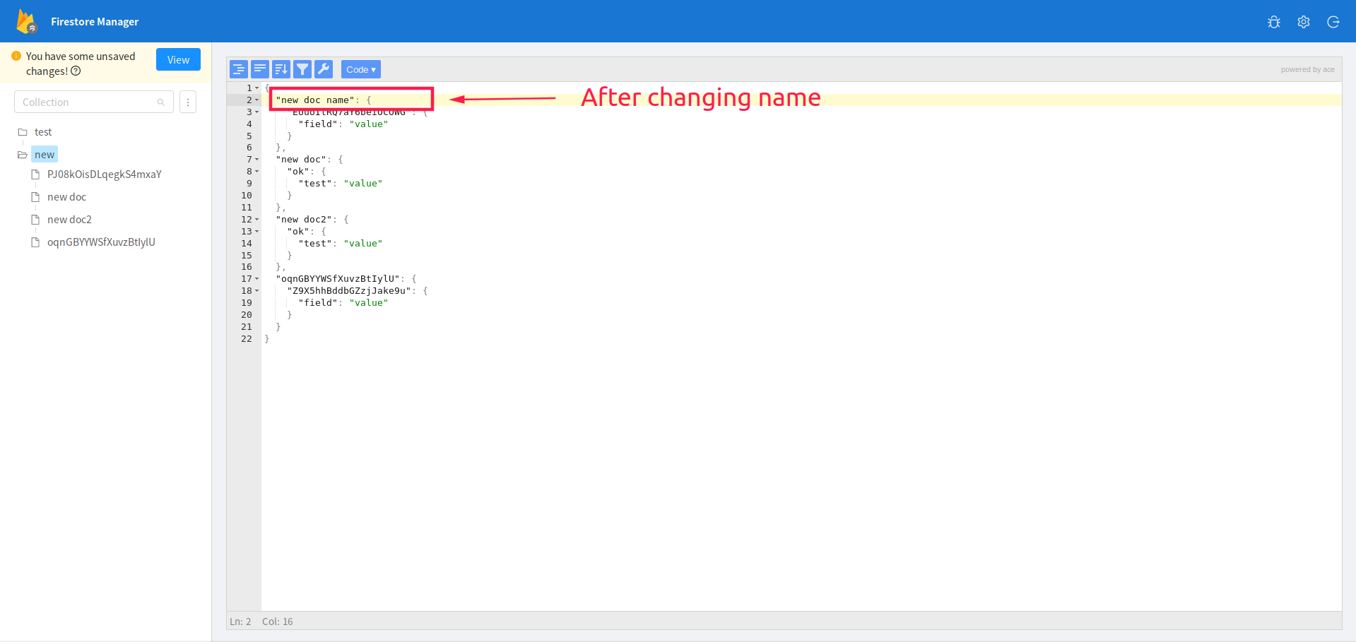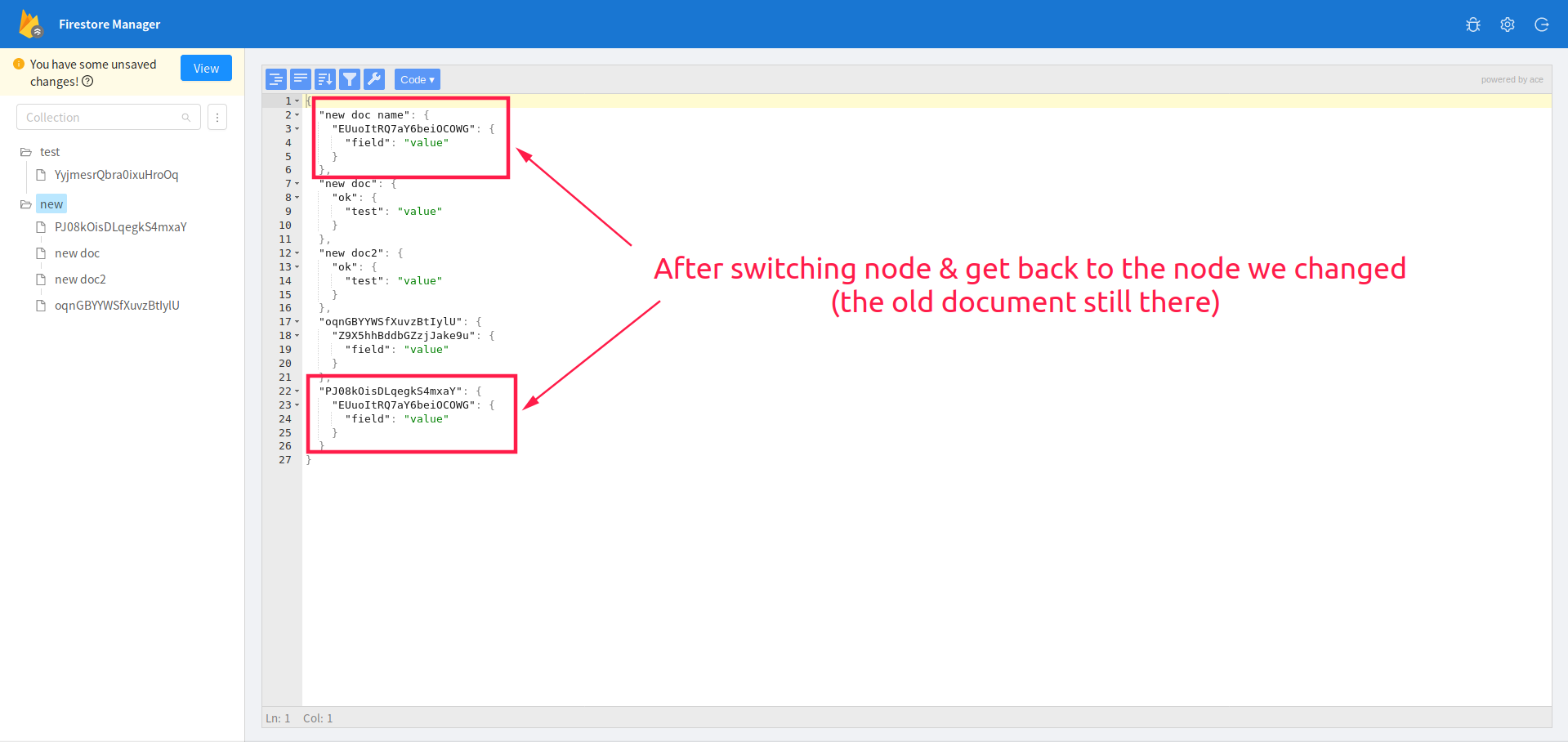 When changing a document name, the old document still exists & may appear again when switching nodes or re-selecting the original node (see screenshots below).