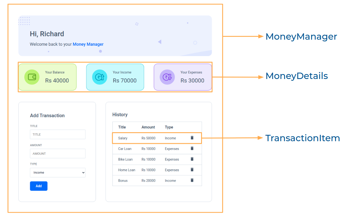 In this project, let's build a Money Manager app by applying the concepts we have learned till now.