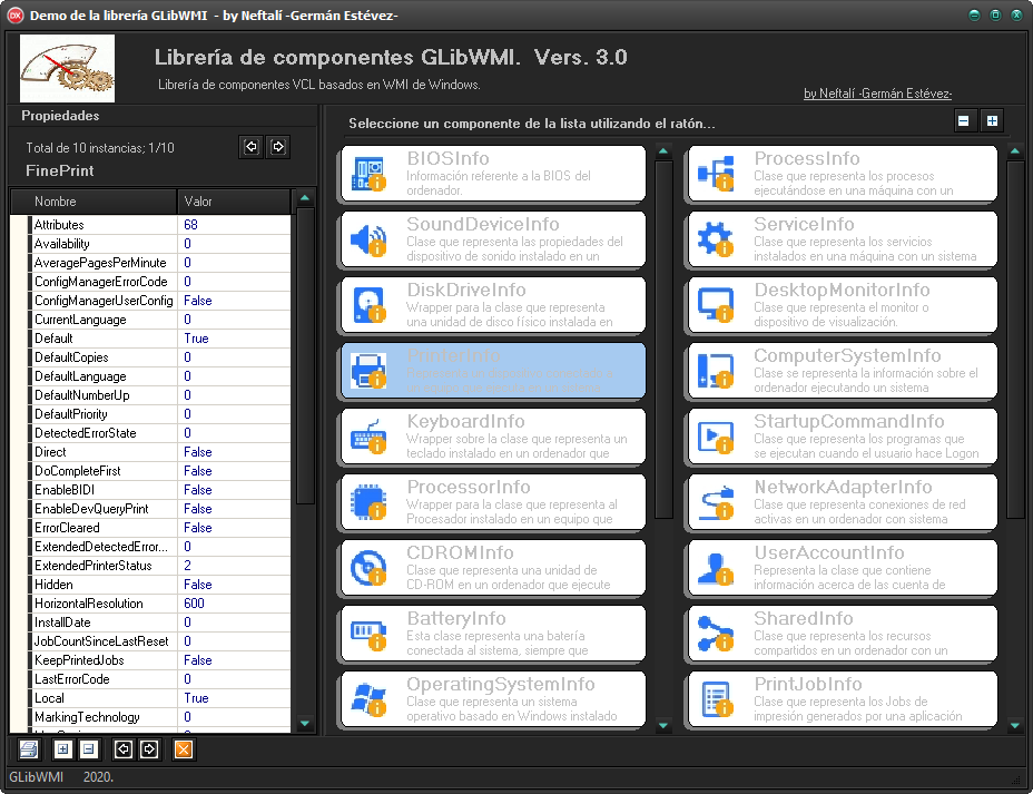 - TPrinterInfo: Capacidades y administración del dispositivo lógico de la impresora.MSDN link: https://docs.microsoft.com/en-us/windows/win32/cimwin32prov/win32-printer