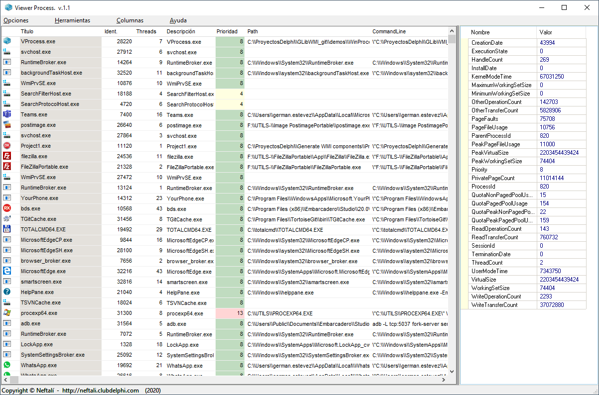 - TProcessInfo: La clase Win32_Process representa una secuencia de eventos en un sistema Win32. Cualquier secuencia compuesta por la interacción de uno o más procesadores o intérpretes, código ejecutable y un conjunto de datos de entrada, es un descendiente (o miembro) de esta clase. Ejemplo: una aplicación cliente que se ejecuta en un sistema Win32.MSDN link: https://docs.microsoft.com/en-us/windows/win32/cimwin32prov/win32-process