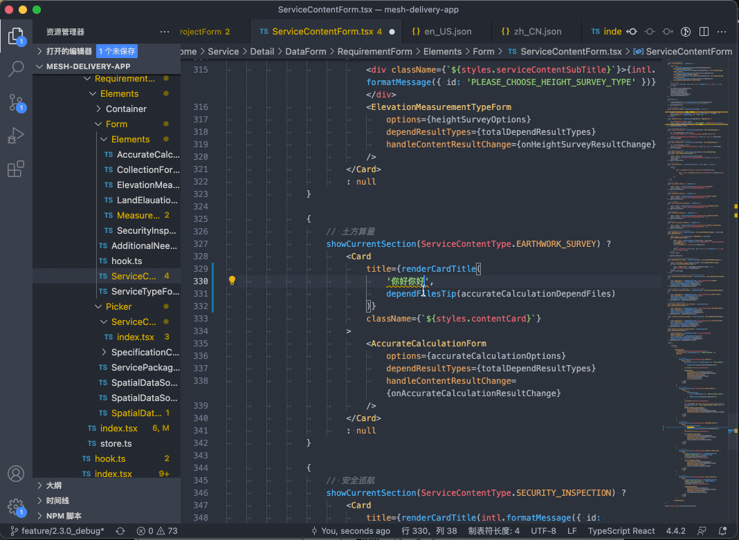 当一个中文文本既不存在已有国际化配置时,该插件会翻译文本生成对应的的 react-intl 代码,并自动修改国际化配置