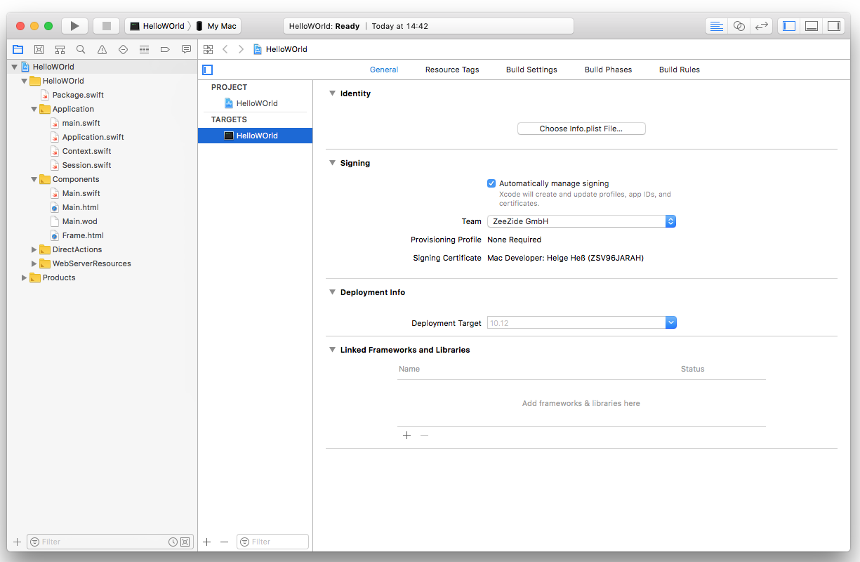 swift xcode link-templates # <-- important!Within Xcode, create a new project (⌘-Shift-N), go to the "macOS" section and select the "WOApplication" template, very much at the bottom of the inspector (pro tip: type "wo" in the filter field at the upper right):