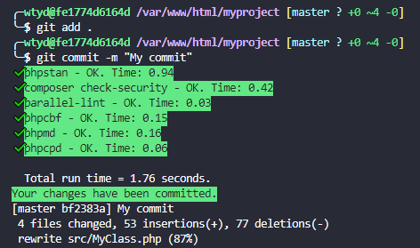 When you commit, all the configured code check tools are automatically launched. If your code pass all checks, GitHooks allows you to commit. If not, you have to fix the code and try again:
