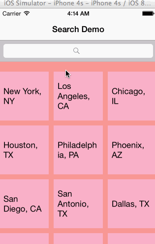We can just as easily use the search controller to search a collection view in place. We still have the presentation of a search interface, but unlike when working with the search display controller we are not restricted to using a table view to display the search results.