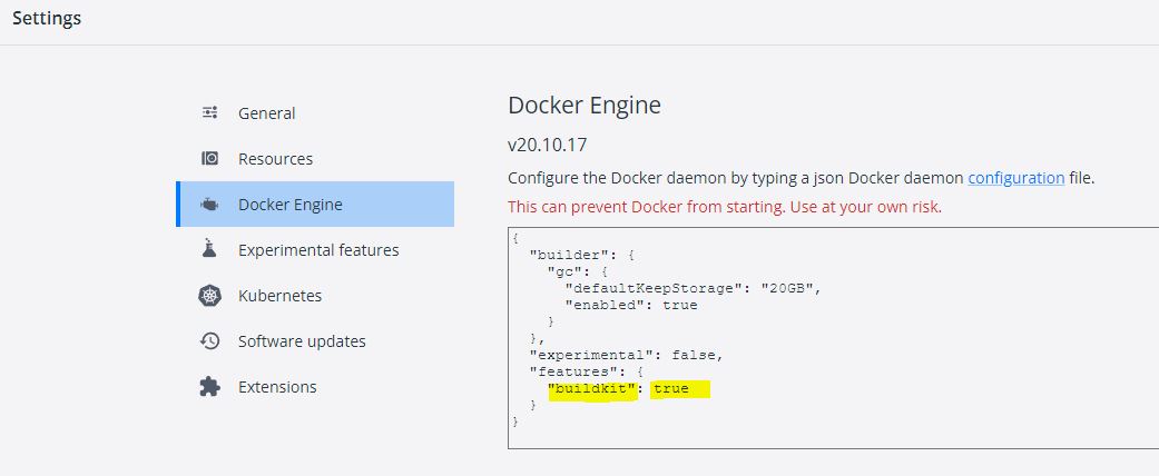 Buildkit needs to be enabled in the daemon.json file: (e.g. From Docker Desktop)