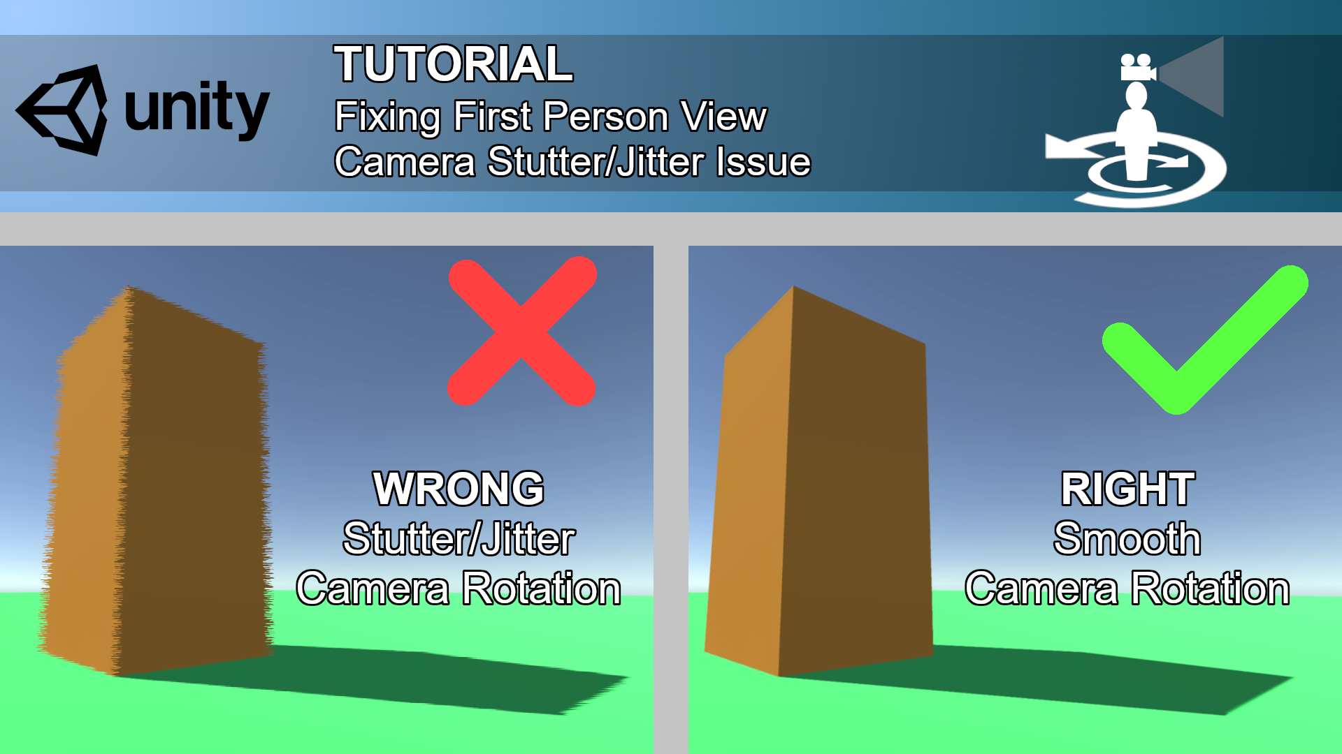 A tutorial on how to get smooth first person rotation in Unity3D. While making a first person view game you will notice mainly in the build game that when you rotate the camera the game stutters/jitters a lot which gets noticable when circuling around an object. In this tutorial I am showing one of a way to fix that. Watch my Video to get a detailed understanding of the issue, the cause of the issue and the solution to the issue. If my solution doesn't work then I have linked to other sources in Research Links that fixes this issue using other means.