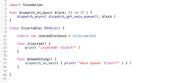 More problematic is the more common use of variables or functions outside a class which are referred to across the files of a bundle. Swift 1.2+ takes the view these "internal" scope symbols should not be available across bundles and are made "private extern" in their object file making them unavailable at run time. This means that the above code will inject but injecting another file referring to the dispatch_on_main function will fail with obscure dynamic loading errors.