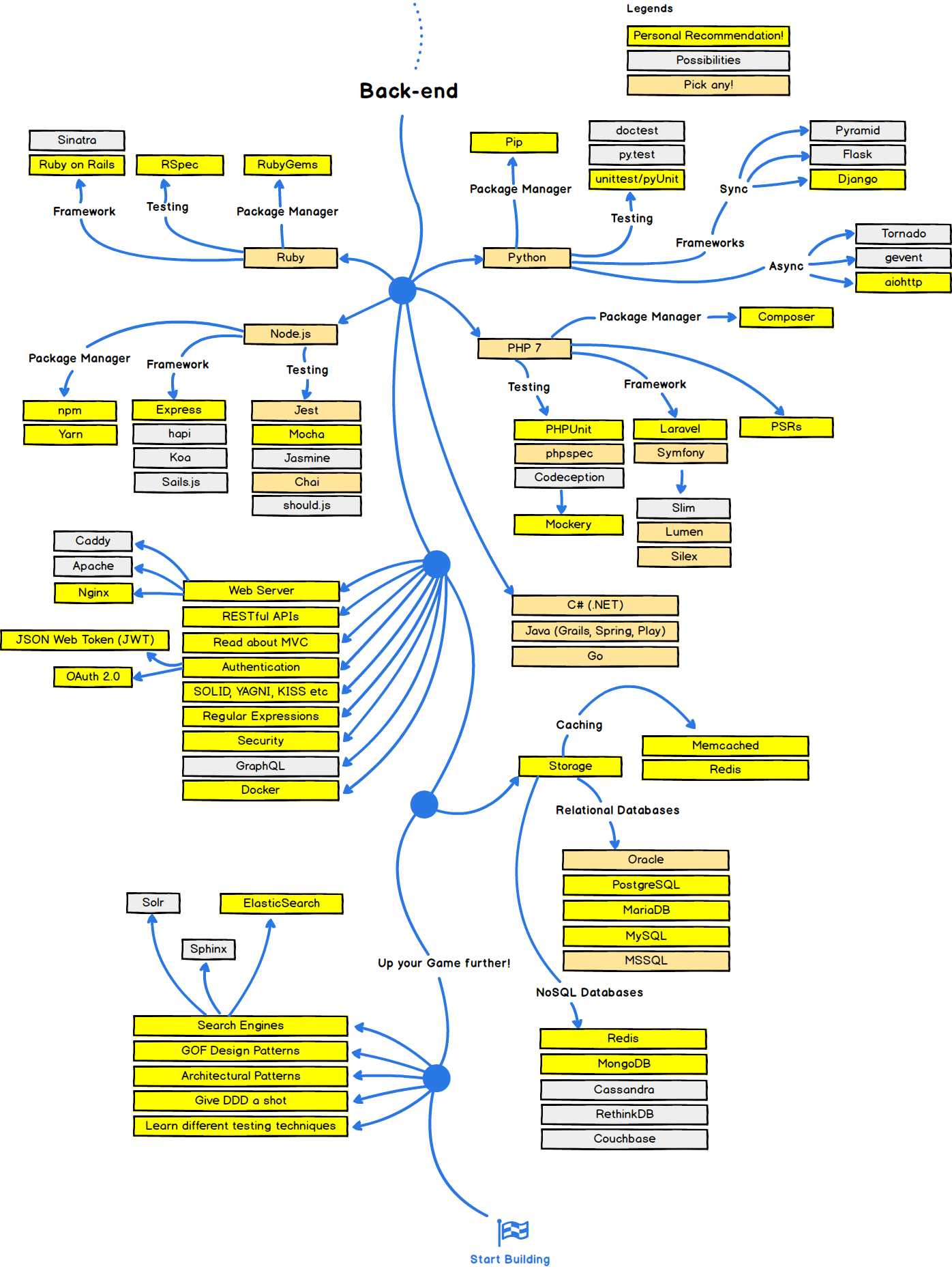 Below you find a set of charts demonstrating the paths that you can take and the technologies that you would want to adopt in order to become a frontend, backend or a devops. I made these charts for an old professor of mine who wanted something to share with his college students to give them a perspective.