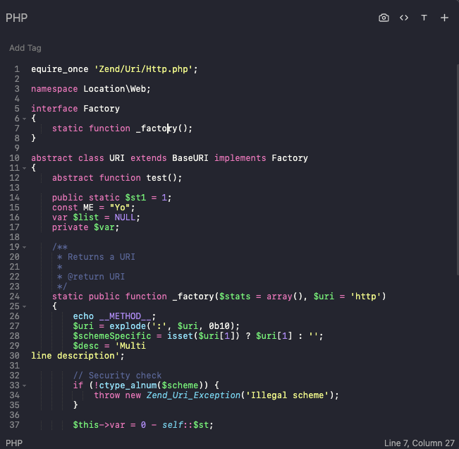I like the syntax coloring, but I am wondering why do I still need a <?php tag if the language syntax is already set to PHP. I think that should be a setting to show language tags or not.