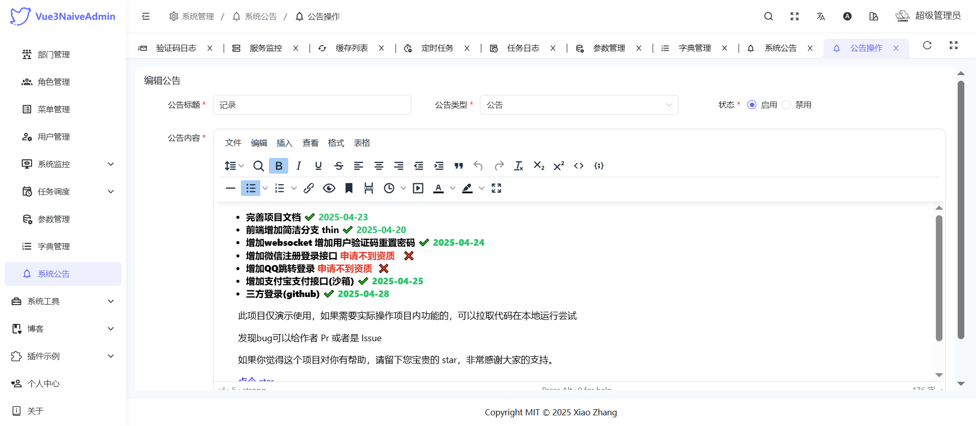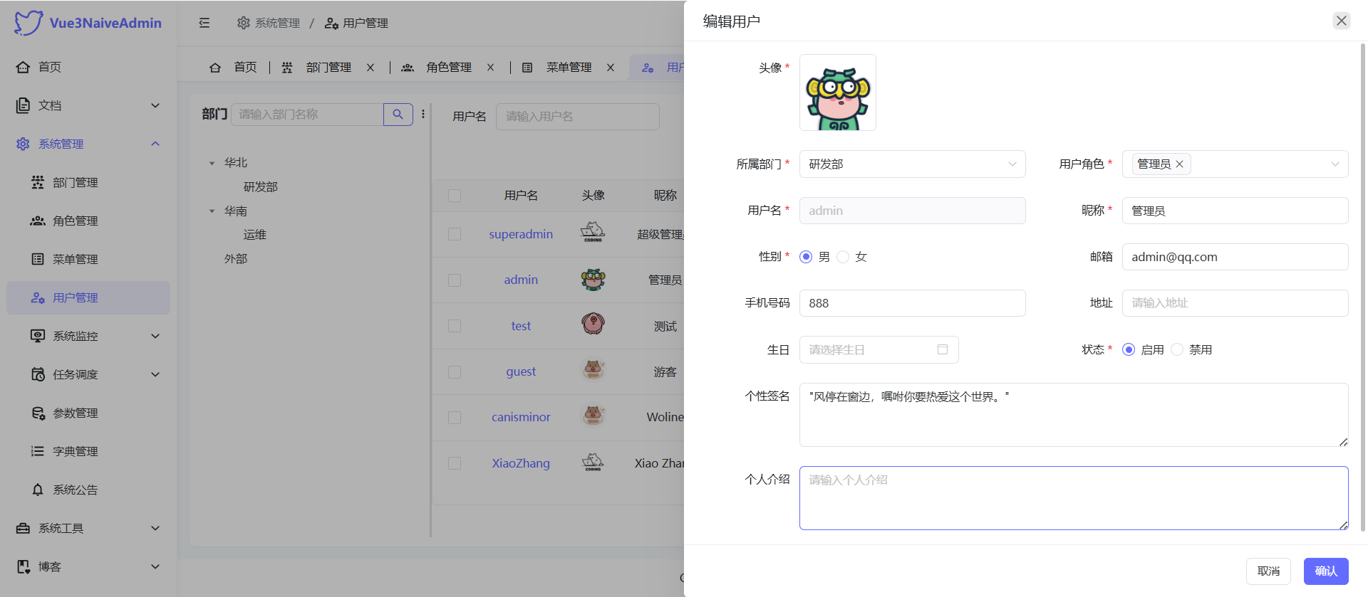 Vue3NaiveAdmin 遵循 SoybeanAdmin 开发规范,保留了 SoybeanAdmin 的所有功能。增加了部分高级组件(使用方式详见组件内README)。框架自带功能使用方式可以在 SoybeanAdmin 官方文档上查阅。