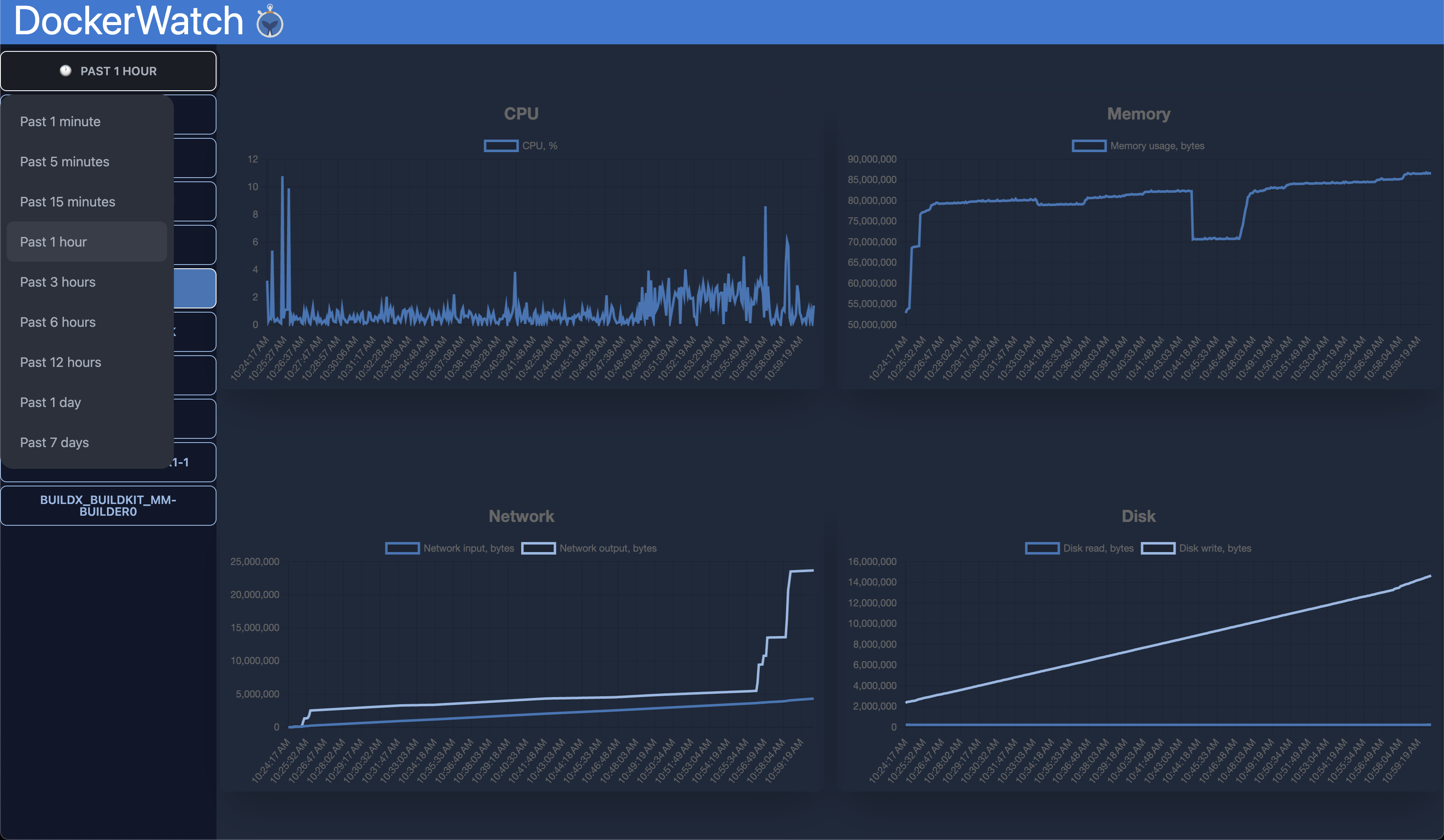 DockerWatch is a containerized application that collects and visualizes Docker container metrics over time.
