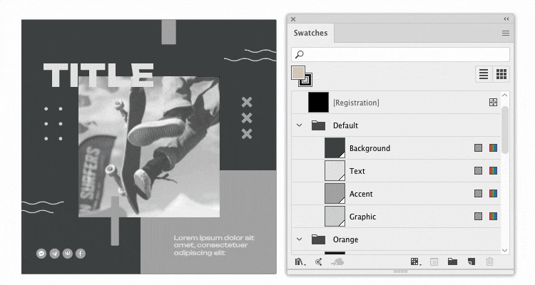 Replaces the values of spot colours in one colour group with spot colours from another group by matching swatch names or by order. In the example, the Default group is replaced. If a color in the target group has the name Accent, the script will look for swatches with a name that contains the name of the target color. You don't need to create palettes with semantic names, just arrange the colors within the groups in the desired order and select the By swatches order option.