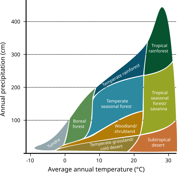 And what about biomes ? Now that you have temperature and humidity, you could try to define conditions on those both parameters to determine in what biome you are ! Let's imagine that we have two axis, the temperature is on the X axis and the humidity on the Y one. You can define a surface on the graph that describe a biome like on this one from wikipedia.