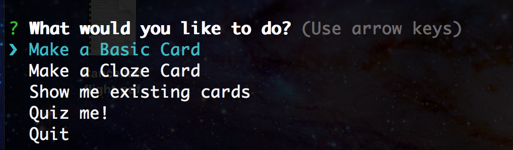 This Node app lets you creat flash cards using the command line. You can make two types of cards, Basic and Cloze. A Basic card will have a question on the front and the answer on the back. A Cloze card will have a sentence or question that has had some of its text removed. Once you make your cards, test your knowledge by quizzing yourself.