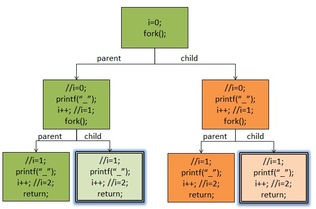 从下图可以清楚地知道,哪个子进程复制了父进程标准输出缓中区里的的内容,而导致了多次输出。(阴影并双边框的那两个子进程)