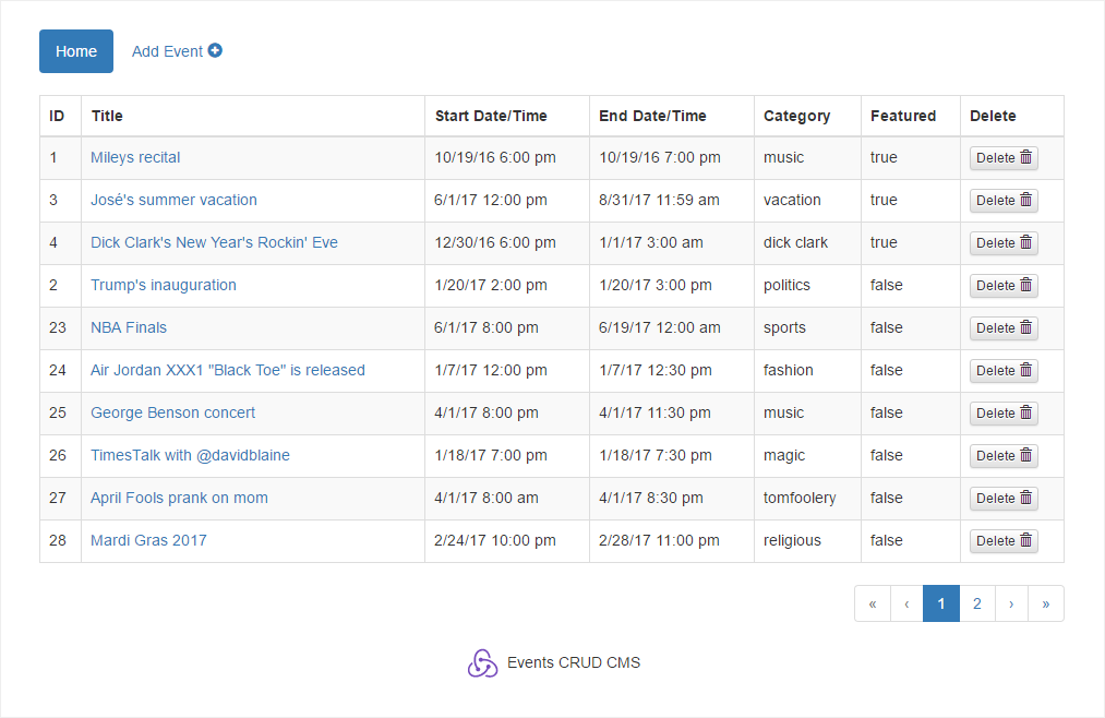event-crud-cms is a full stack web application to Create, Read, Update and Delete a list of scheduled events. The front-end component uses React.js and Redux (among other technologies) to display and update the data as a single page application. The data for the application is retrieved from a back-end component that uses Express, Seqeulize, and PostgreSQL.