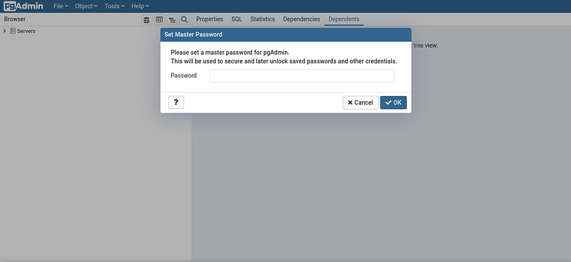 Terminando de instalar os dois, quando abrir o pgAdmin ele vai subir o client no seu browser e em seguida pedir pra você definir uma senha, vou definir a minha como “vapordev123”.