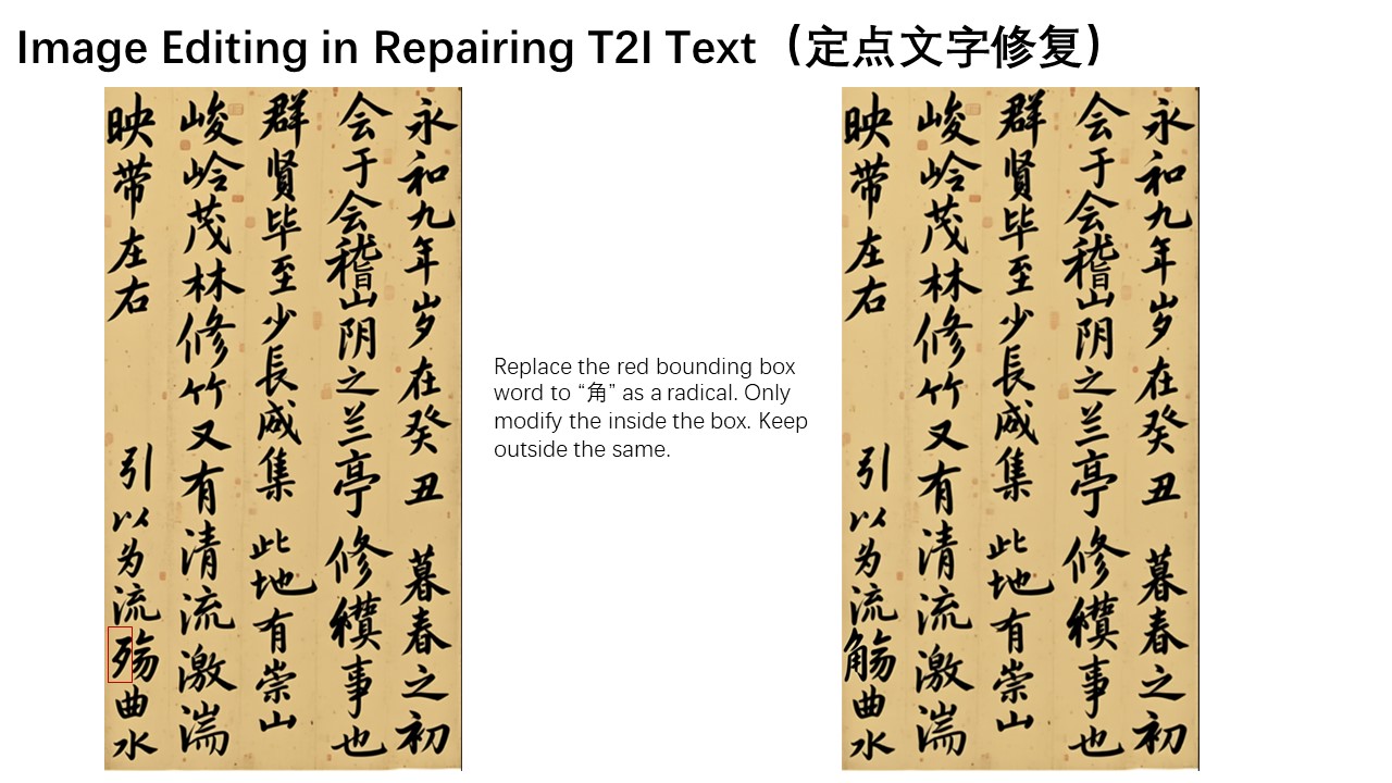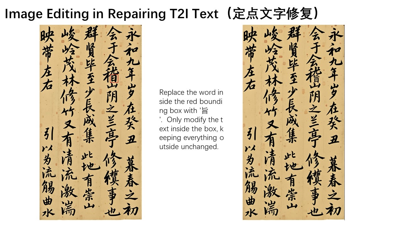 In this artwork, several Chinese characters contain generation errors. We can leverage Qwen-Image-Edit to correct them step by step. For instance, we can draw bounding boxes on the original image to mark the regions that need correction, instructing Qwen-Image-Edit to fix these specific areas. Here, we want the character "稽" to be correctly written within the red box, and the character "亭" to be accurately rendered in the blue region.