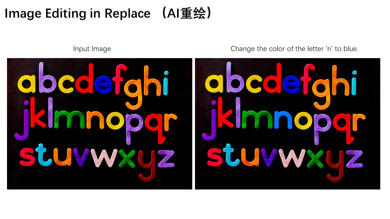 Additionally, the color of a specific letter "n" in the image can be modified to blue, enabling precise editing of particular elements.
