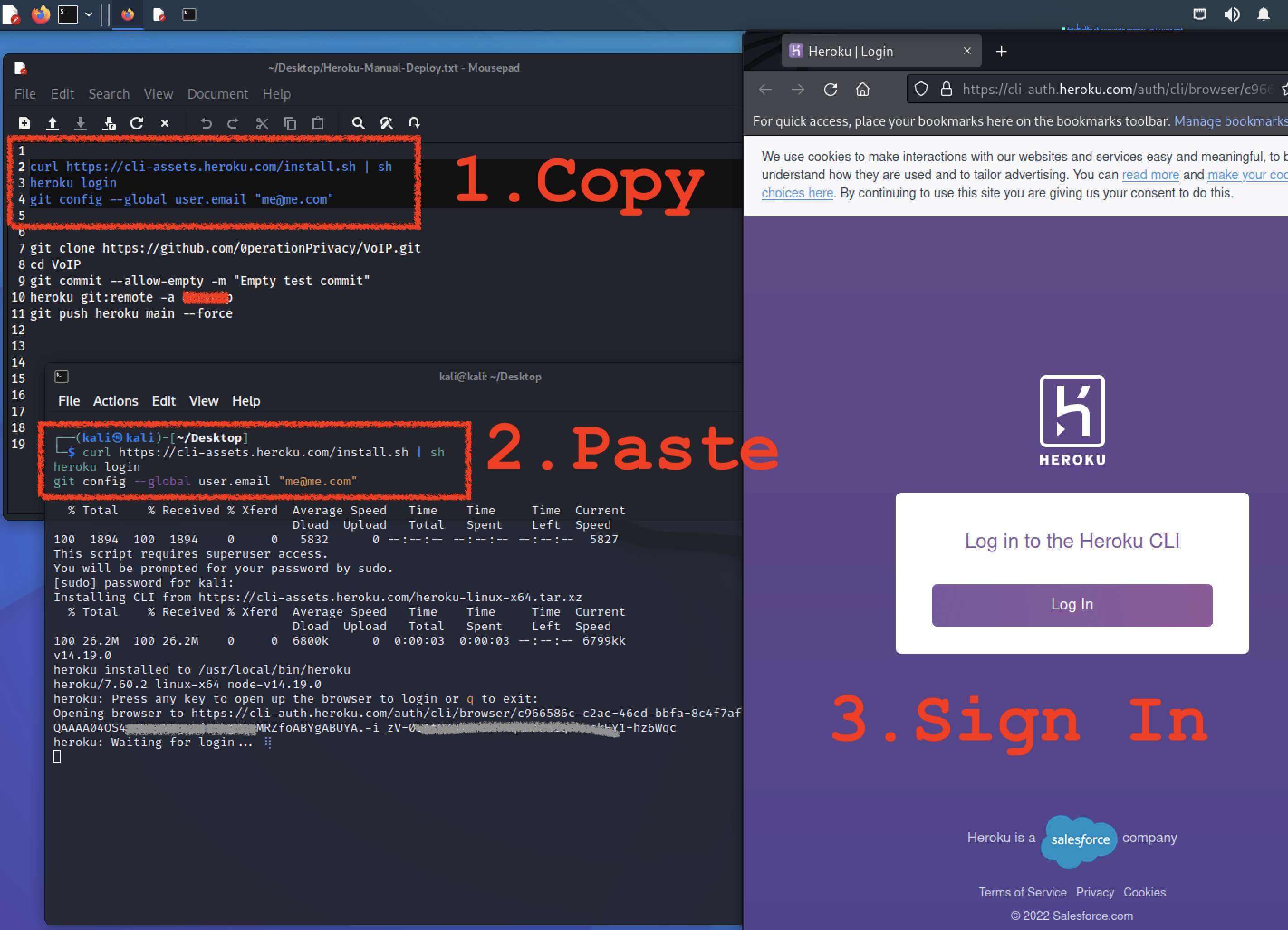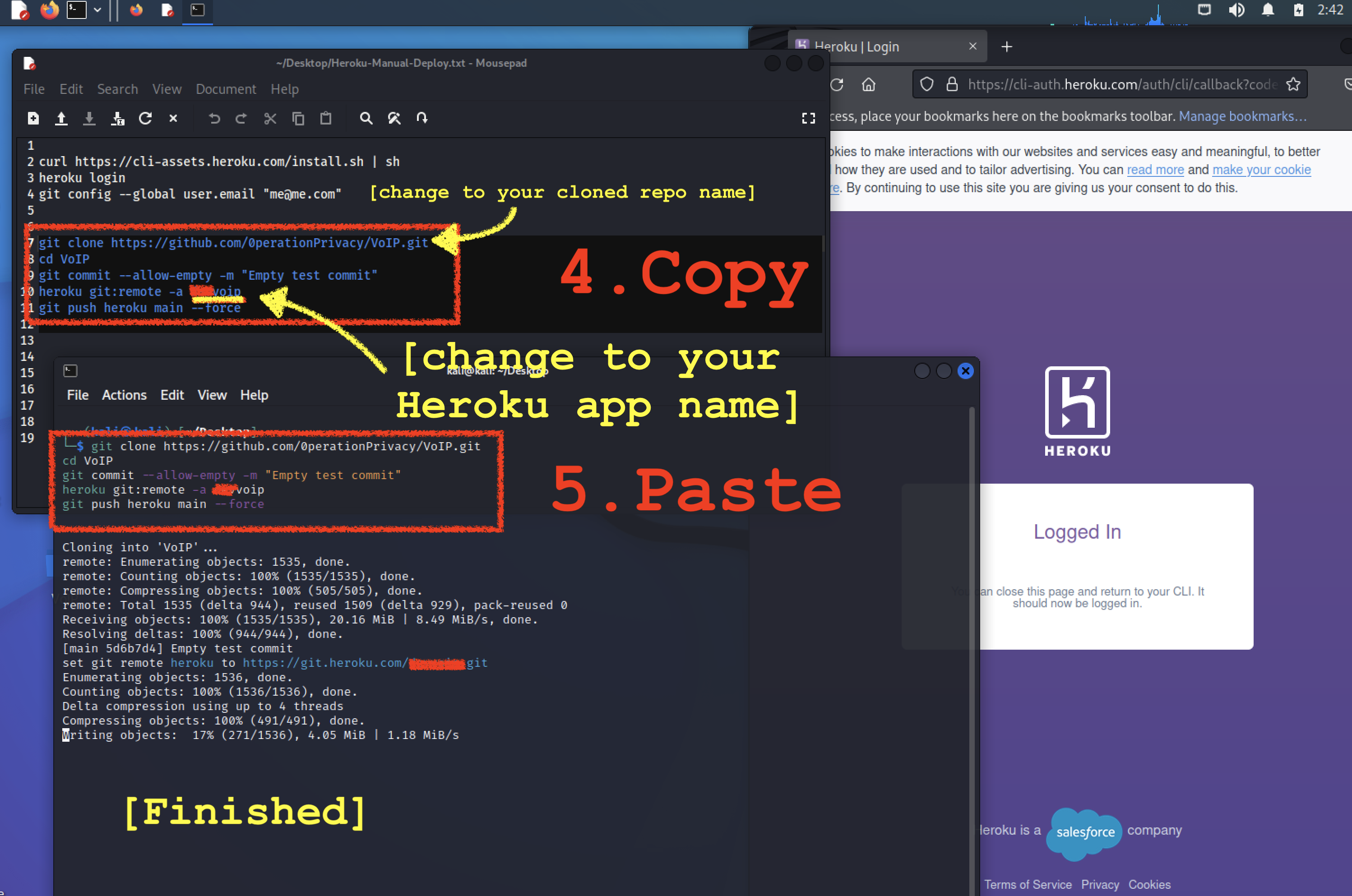 Here's how I worked this repair using Windows: First a Note: As a bit of a newbie to a lot of the services that are required to run this VoIPSuite, I had trouble figuring out what the error message that came from Heroku meant. But as it's explained nicely in this thread, it has to do with Heroku intentionally breaking "Automatic Deployments" from Github for security reasons. So, we now have to manually download the latest deployment from our Github account and then manually upload it to heroku. We will use GIT to handle the downloading, uploading and compiling. INSTALL GIT As a PC user, I chose "Git for Windows" and chose the 64 bit standalone installer from here: https://git-scm.com/download/win Before I ran the installer, I installed a 32-bit version of Notepad++: https://notepad-plus-plus.org/downloads/v8.3.3/ I did this because the GIT installer sort of asks for it. Then I installed Git for Windows (Git-2.36.0-64-bit.exe) and accepted all the defaults for all the questions it asked me during the install. This worked out fine. (when it asked which text editor I wanted to use, I chose Notepad++) Notepad++ turned out to be unnecessary, but it's not harmful, and that's what I did. INSTALL HEROKU curl https://cli-assets.heroku.com/install.sh | sh But I'm on Windows. Fortunately, Heroku has a CLI help page for other platforms: https://devcenter.heroku.com/articles/heroku-cli There is a link "First-time GIT setup" (a prerequisite to installing heroku CLI) git config --global user.name "John Doe" Since you have GIT installed, you are basically just writing these lines into the GIT config page on your PC. I opened up a command prompt with Administrative privileges. (as instructed) I then entered: git config --global user.name "John Doe" (I use [email protected] because it appears later in the instructions. You can use it too.) I later noticed that in the OP instructions to this thread, we actually set the global user email to [email protected]. So even though I set my config via the 2 lines above, I followed the rest of the instructions to the T. After making the tweaks to my GIT config, I downloaded and installed the 64 bit version of the Heroku CLI (heroku-x64.exe)> I got that file from the heroku help page referenced earlier: [(https://devcenter.heroku.com/articles/heroku-cli)] Now that the GIT and HEROKU CLIs are installed to your PC, you will issue commands via your Command Prompt terminal and these commands are understood and acted upon. GET YOUR FORK You are looking for these magic words: "This branch is up to date with 0perationPrivacy/VoIP:main." Why? You will be downloading from your github account, so you need to make sure what's stored in your repository is the latest copy of VoIPSuite. HEROKU LOGIN heroku login This causes the heroku website login page to open in a browser. Enter your heroku credentials. Get yourself logged in. next, go back to the command prompt and type the following (then hit RETURN or Enter) git config --global user.email "[email protected]" then type git clone https://github.com/yourGithubUserNameHere/VoIP.git obviously, replace yourGithubUserNameHere with your github username for example, if I log into Github, and want to get to MY FORK of the VoIPSuite, my URL is: https://github.com/JoeUser/VoIP JoeUser is my username That git clone command will download a copy of your fork of VoIPSuite via GIT into your PC. next type: cd VoIP and hit return that navigates us into the VoIP directory next type: git commit --allow-empty -m "Empty test commit" and hit return (you are running a little connection test to GIT) Next, you have to identify the receiving account on heroku for your coming upload You'll have to personalize the following code "template" or example a bit before using it. the code template is: heroku git:remote -a tidbit I will replace "tidbit" with a little bit of the URL of my VoIPSuite instance on Heroku. Specifically - if I want to use my VoIPSuite, I go to So, bada-BING is the "tidbit" that I would put into the code template. Example - the template: Just enter your app's name instead of tidbit or bada-BING and hit return You have just set the receiving account on heroku for your coming upload Next type git push heroku main --force and hit return. It will take a little time but this will upload and compile your app onto your heroku account. (Got an error? see below*) VOILA, you have now made heroku happy and your VoIPSuite is back in action. Thanks to to OperationPrivacy for this swell app. I hope these instructions are helpful to somebody.*Got an error? such as: You will get an error if this is not your first time doing this. That's because you have already creatged a VoIP folder inside C:\Windows\System32 and as a safety measure, GIT will not drop files in an existing GIT folder. Look into your PC. If you see see C:\Windows\System32\VoIP it's because that folder was created when you 1st GIT-downloaded your VoIPSuite repository. My fixit was to do the following, and in fact, this would be the succinct code I would run each time I needed to download and push an update of VoIPSuite from github to heroku. open command prompt with administrator privileges this puts all those repository files onto your PC here: now type next type: You may have to close any opened VoIPsuite browser tabs and log back in. |