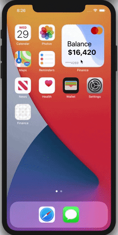 Finance Widget SwiftUI iOS 14 Widget for Banking application built with swiftUI Preview 3rd Party package ProgressBar - Circular progress bar that supports animated text, built with SwiftUI. SwiftUICharts - Swift package for displaying charts effortlessly. Built With SwfitUI - To build user interfaces across all Apple platforms. Xcode12 - Latest beta version.