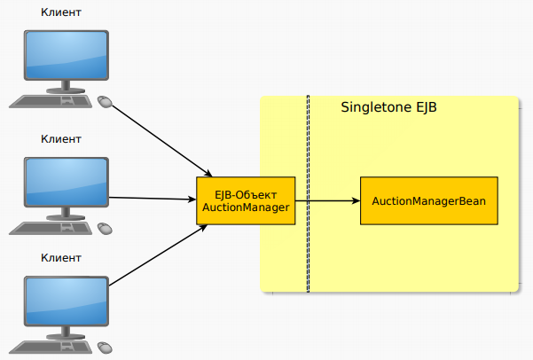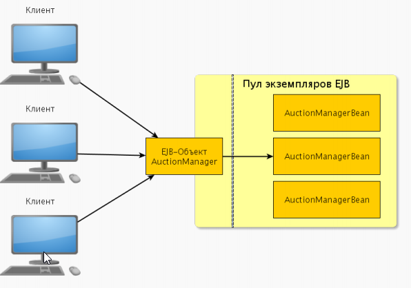 Тут важно заметить, что нет необходимости создавать для каждого клиента отдельный EJB-объект и в пуле находится три объекта AuctionManagerBean.