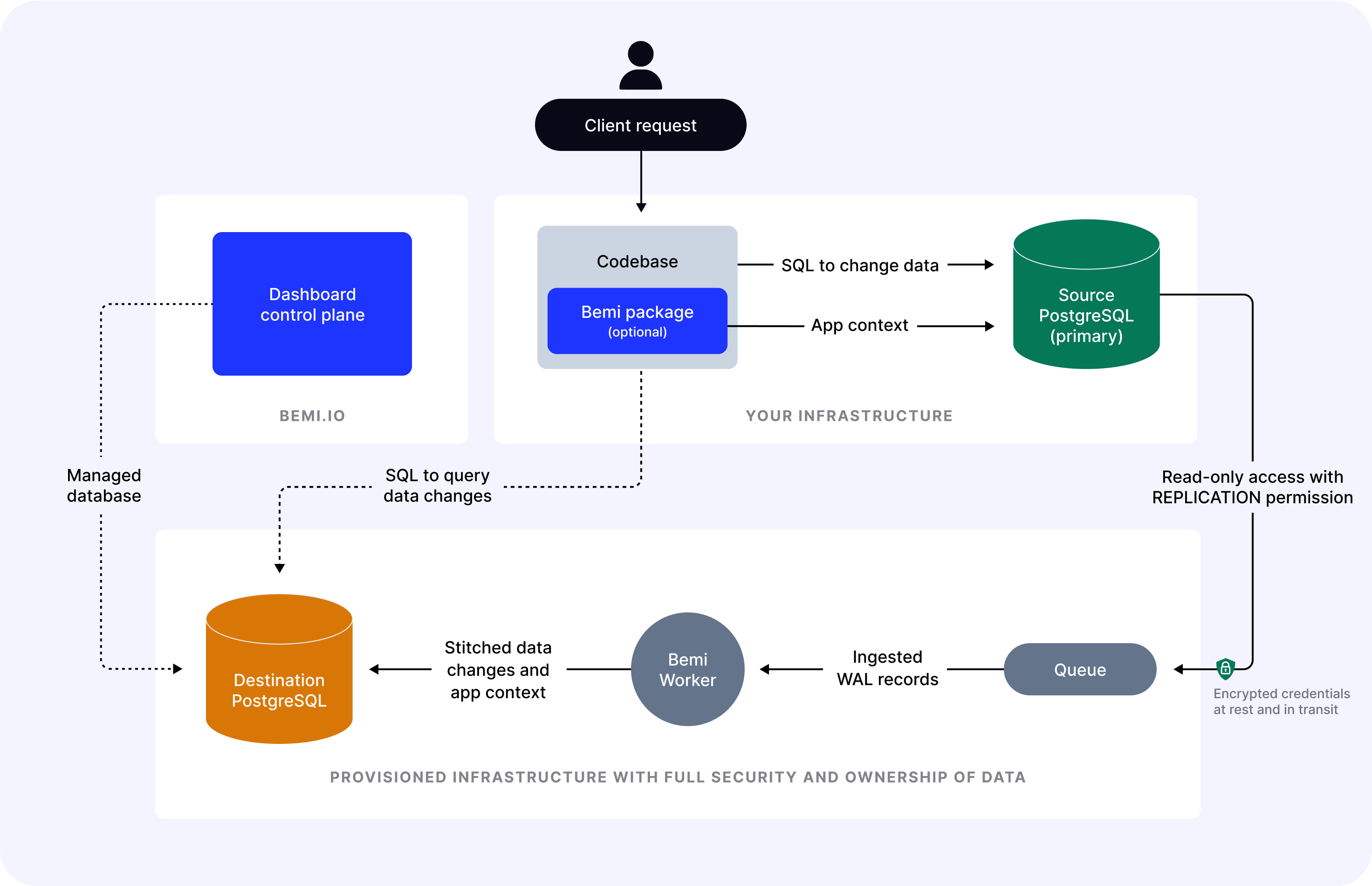 Designed with simplicity and non-invasiveness in mind, Bemi doesn't require any alterations to your existing database structure. It operates in the background, empowering you with data change tracking features.