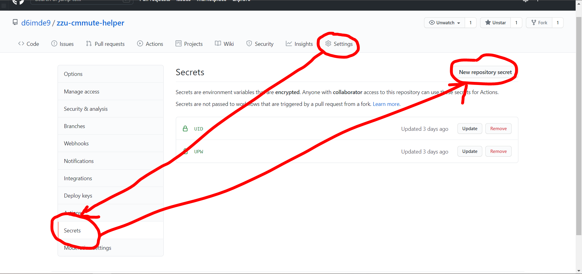 Name栏输入UPW,Value栏输入自己的登录密码,然后点击Add secret。 - 第三次点击