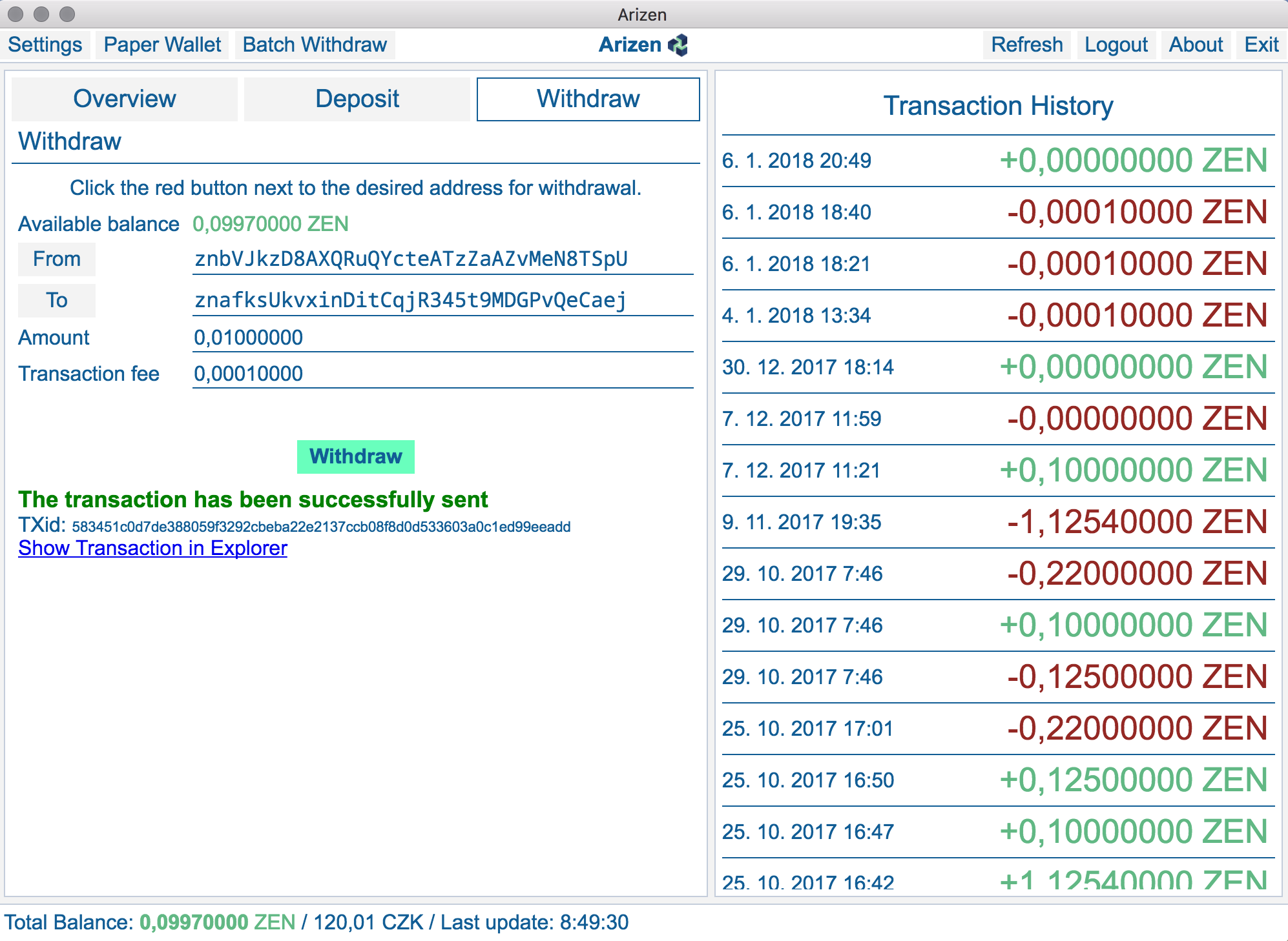 - Feature: Paper wallet - you can create QR codes (private key and address) which can be exported into PDF file and printed. This created address can by included to your Arizen or not.