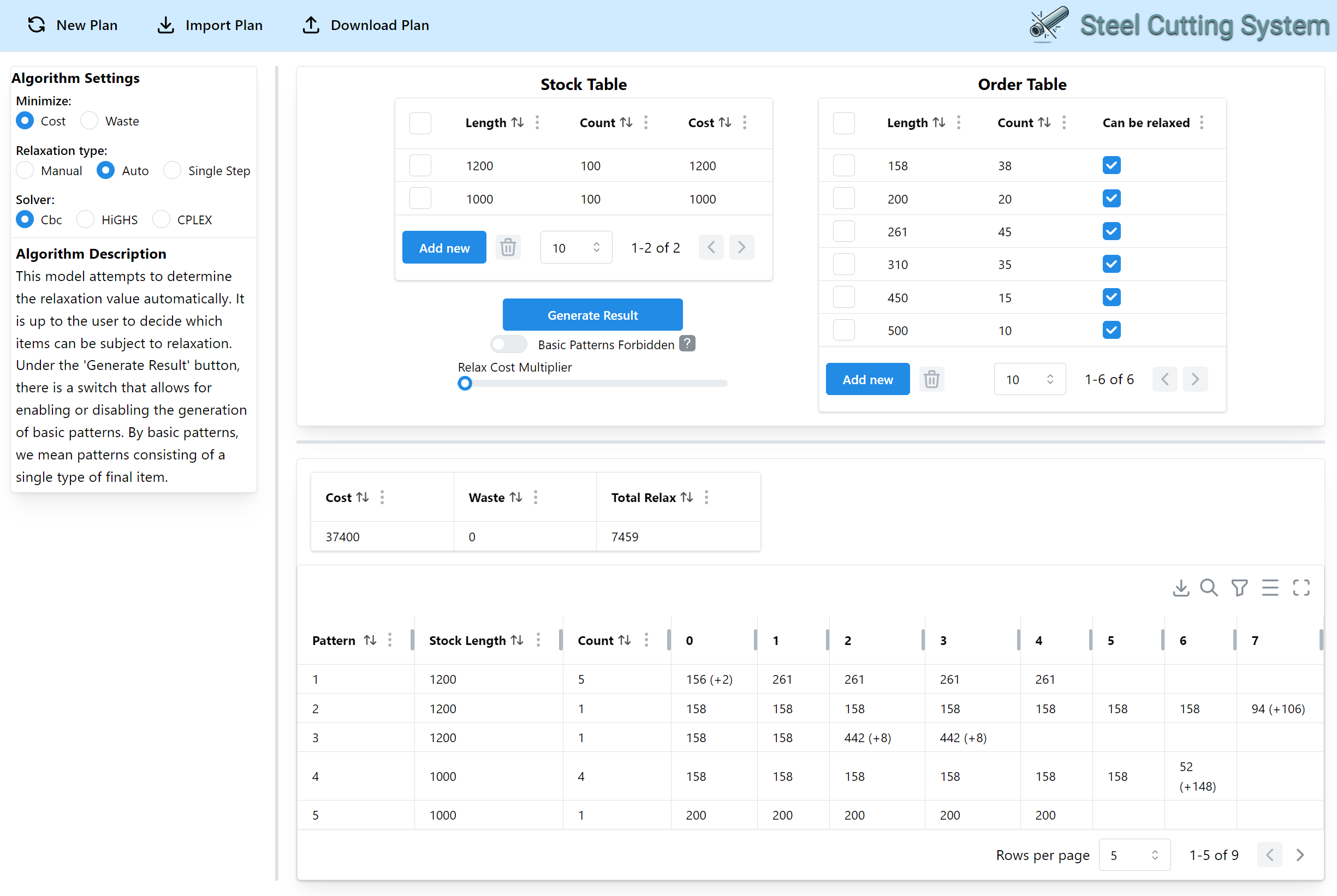 Web application that solves the cutting stock problem with several options to shorten final materials if it allows for obtaining better patterns. Created as the part of master's thesis.