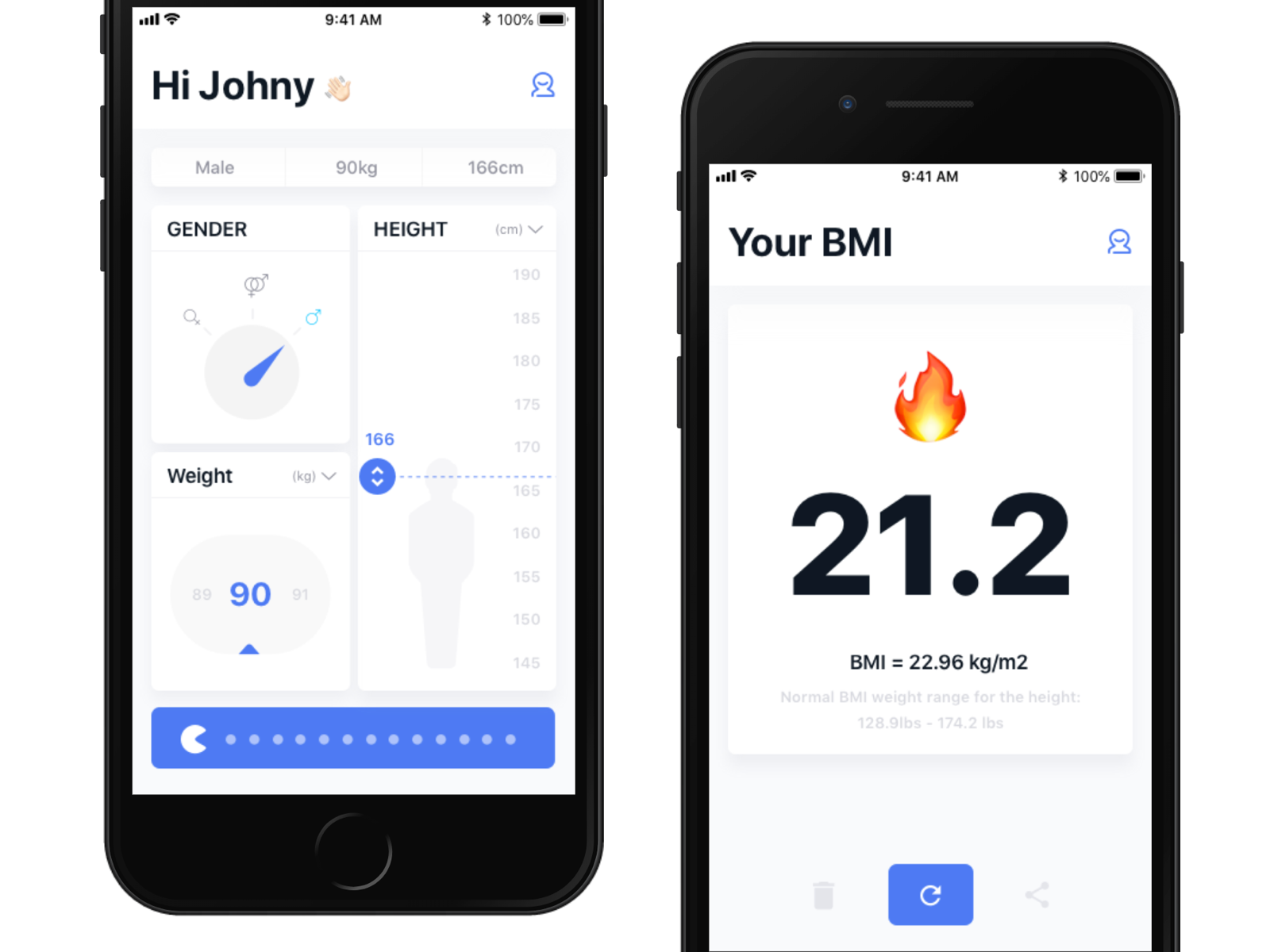 BMI Calculator Implementation of Johny Vino's design. Design(s): Implementation: Related blog posts GenderCard WeightCard HeightCard Static layouts Animated slider hint Custom slider Animated transition Available also on Medium! See all related Medium posts Questions? Contact me at [email protected]