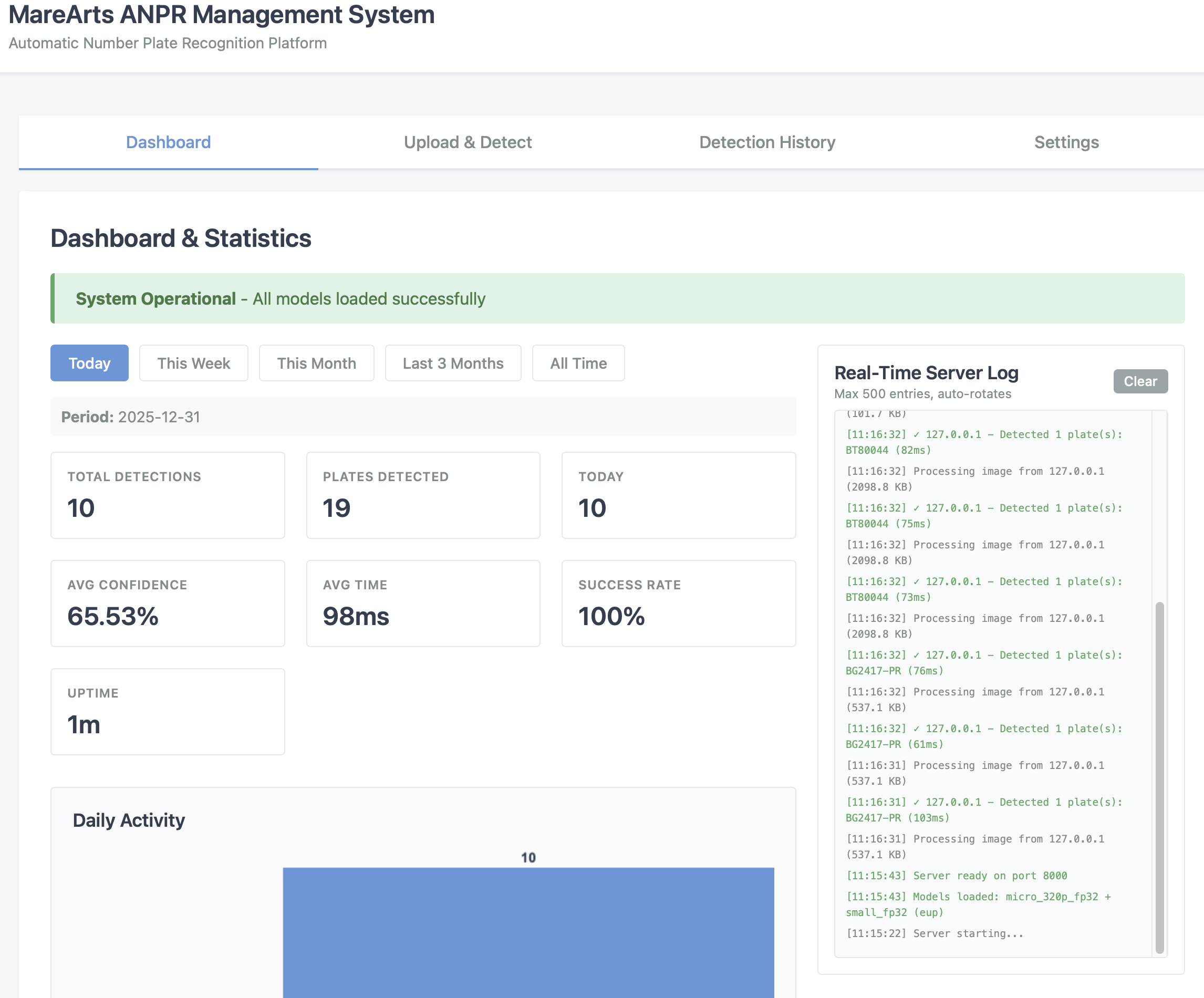 Deploy a complete ANPR management system with real-time monitoring, detection history, and visual analytics.