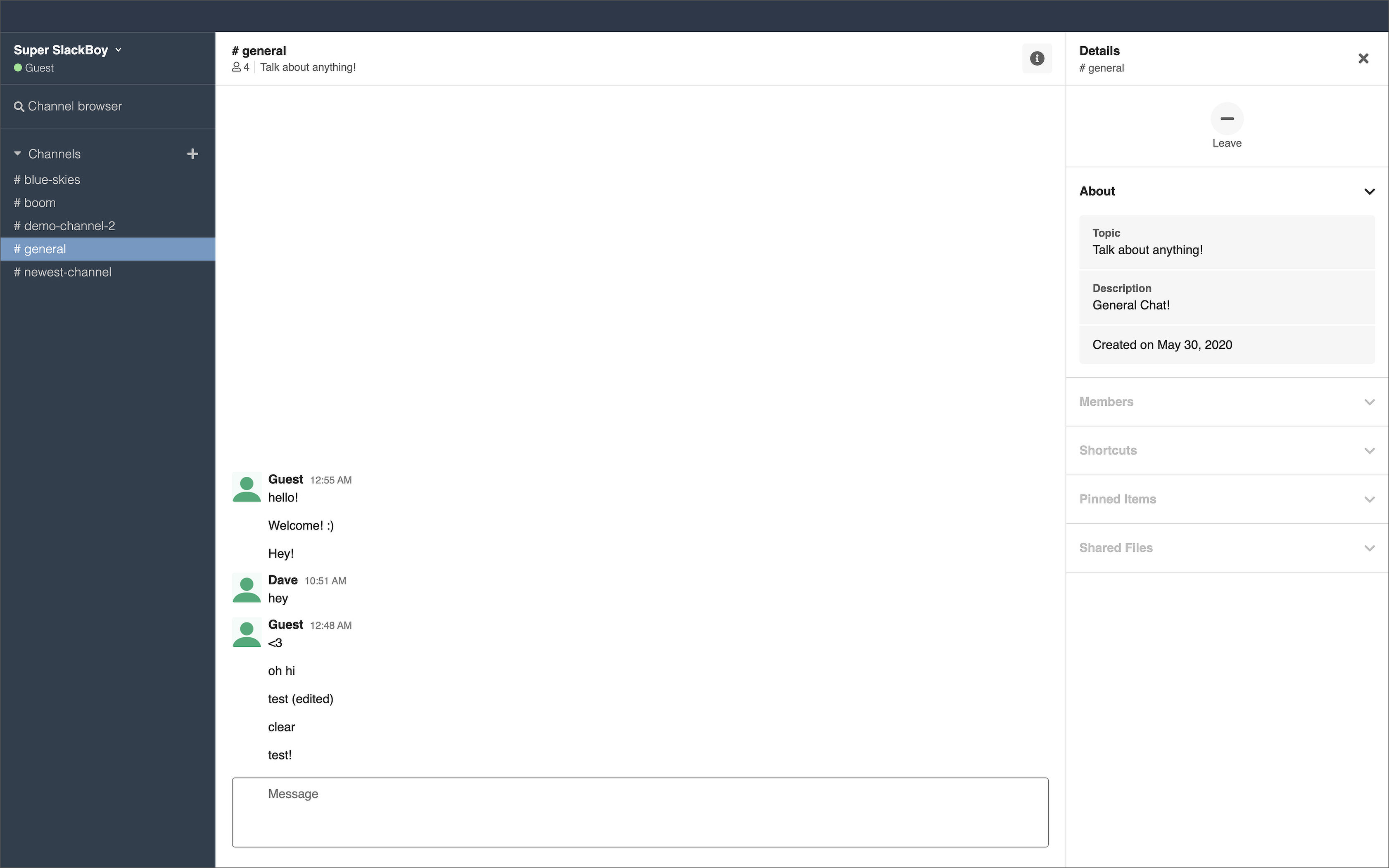 Super SlackBoy is a light weight communication application where users can post real-time messages in channels for others to view. Chat messages persist between sessions.