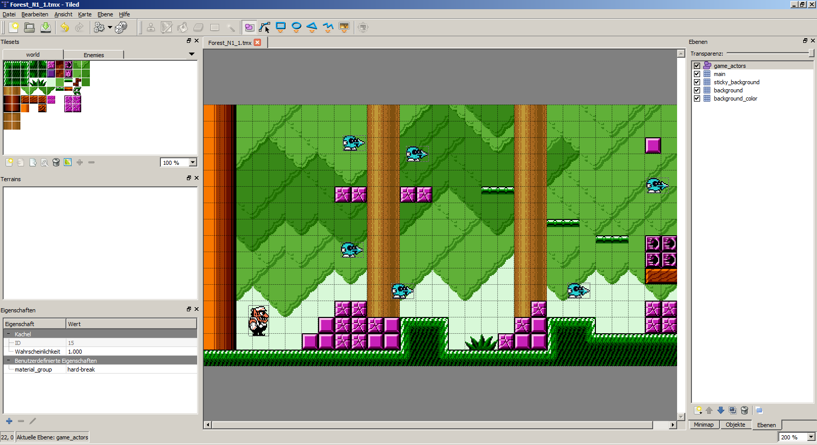 If you want to create your own levels you can do so easily using the Tiled-map editor. Just edit the file Forest_N1_1.tmx, everything is set up. Moving entities like Wario or Spearheads go onto the layer 'game_actors', while tiles regarding the leveldesign belong to the layer main. Every tile has the property material_group (editable on the bottom left of the screen). Change this to solid, hard-break or soft-break to enable collision, or to anything else to disable it.