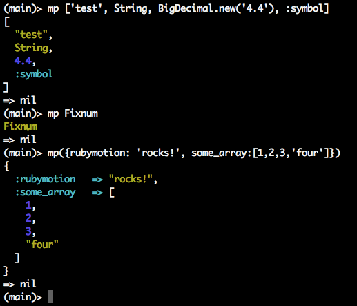 mp "My String", force_color: :blue # This is usually yellow- Add more core objects people want to output: