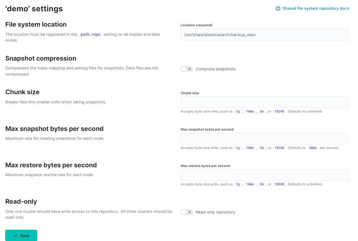 File system location, type:/usr/share/elasticsearch/backup_repo. Ignore other fields and Save.