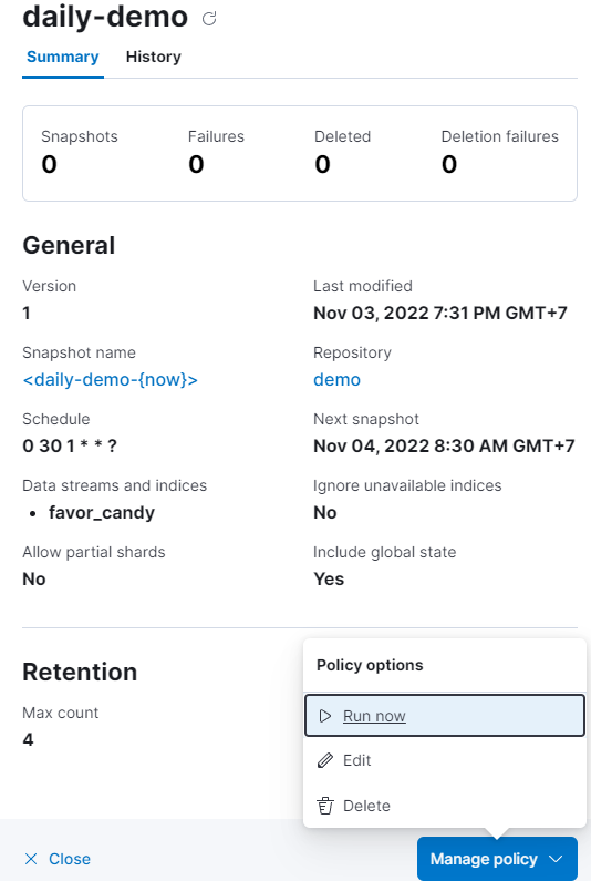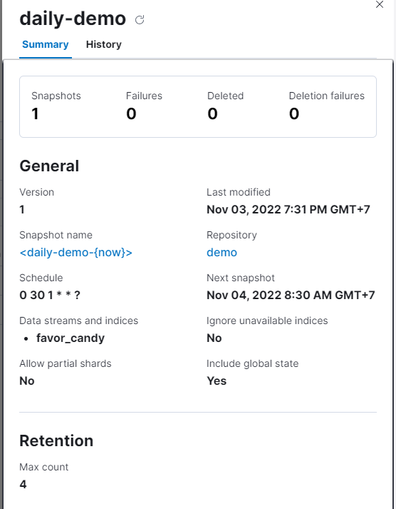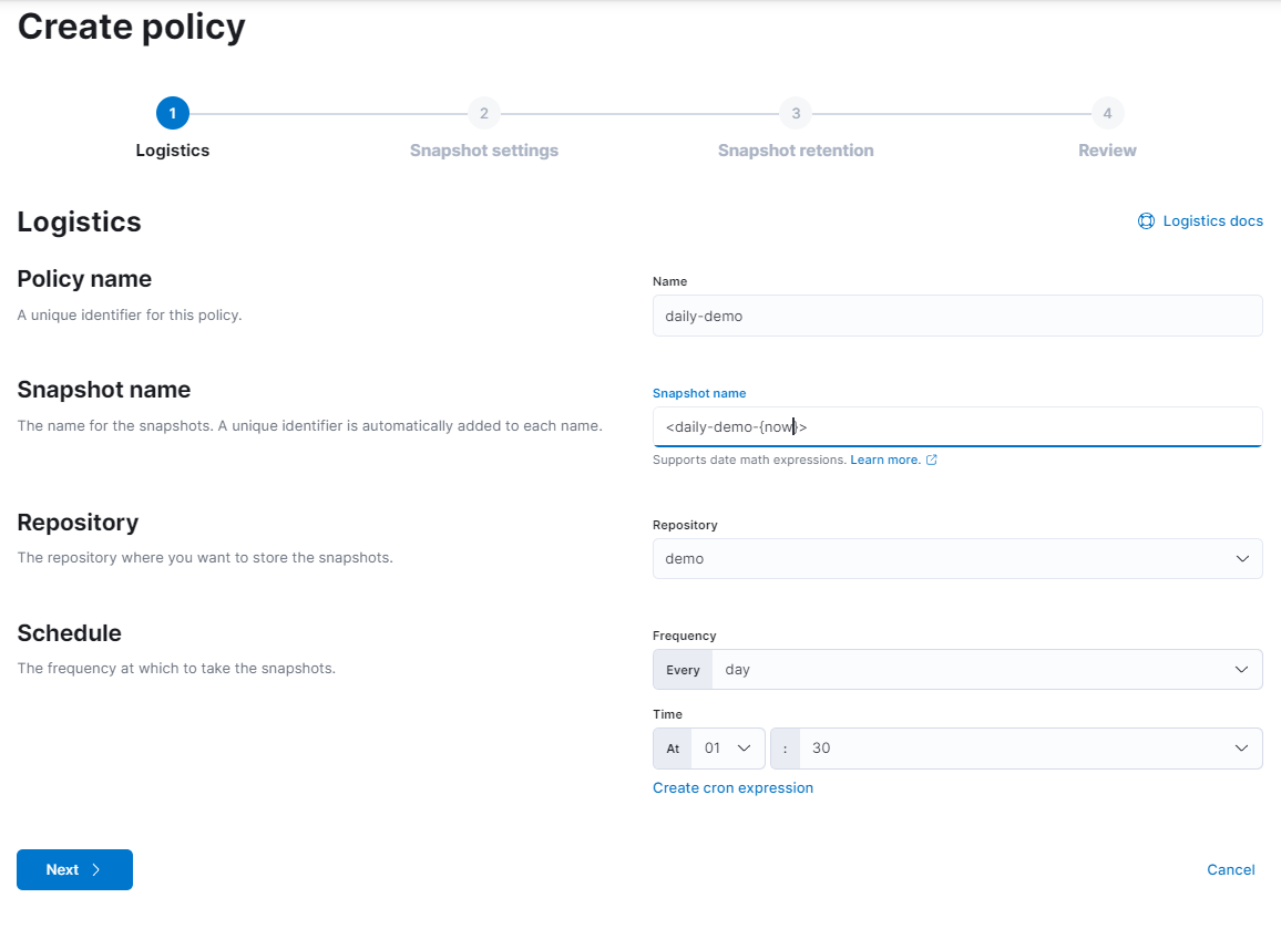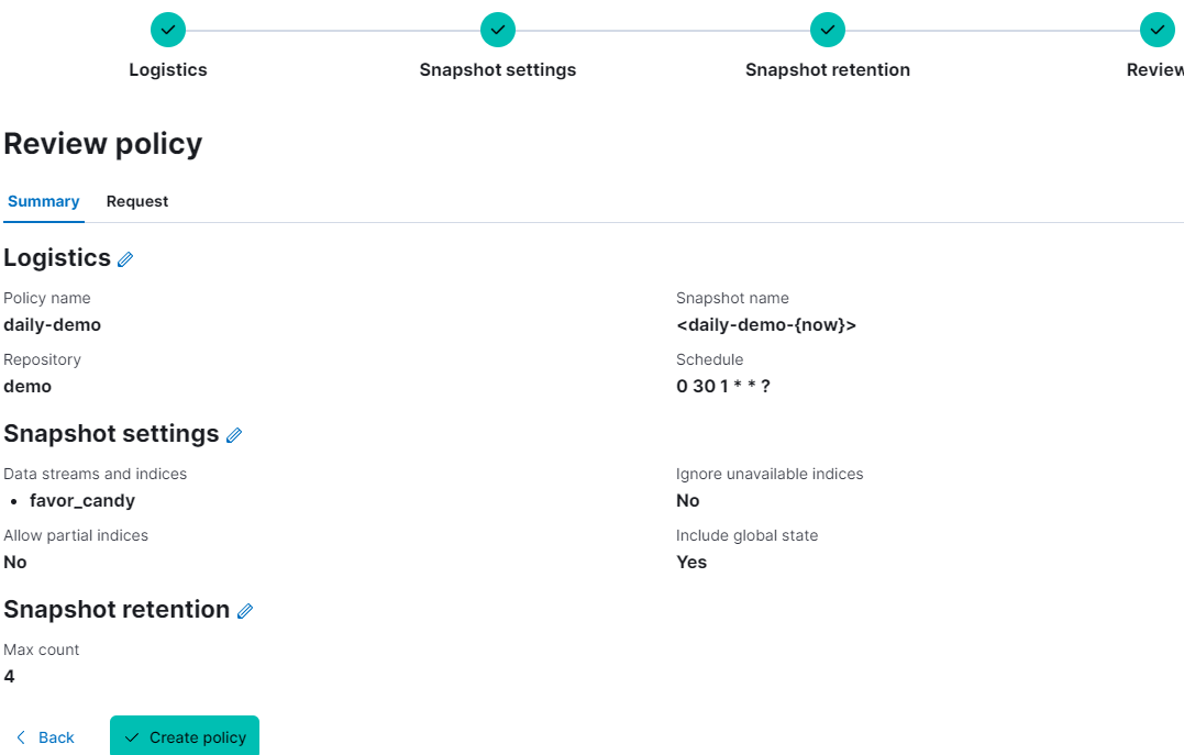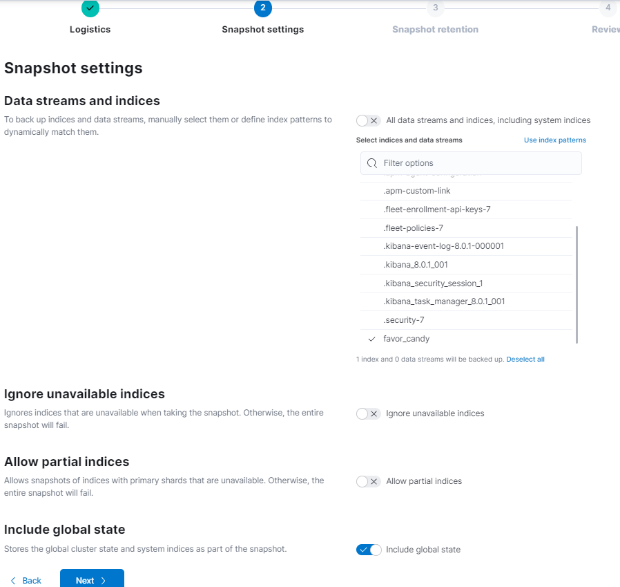 - At step 2, Snapshot settings, in Data streams and indices, choose only my index: