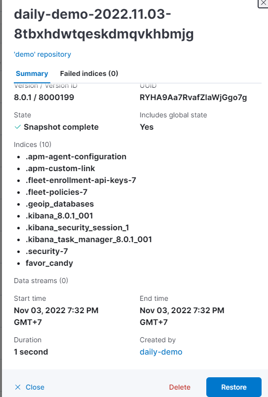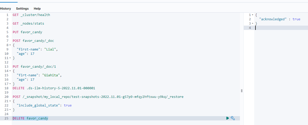 Elastic has strict rules about restoring indices. It will not allow to restore system files nor the other indices unless they are deleted. This part will restore the indices that I have written inDev Tools