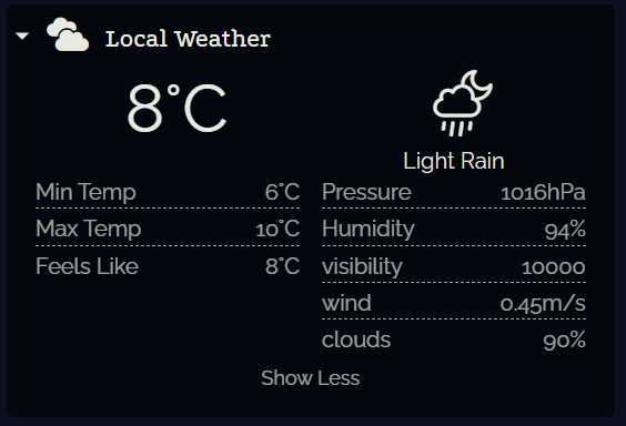 A simple, live-updating local weather component, showing temperature, conditions and more info.