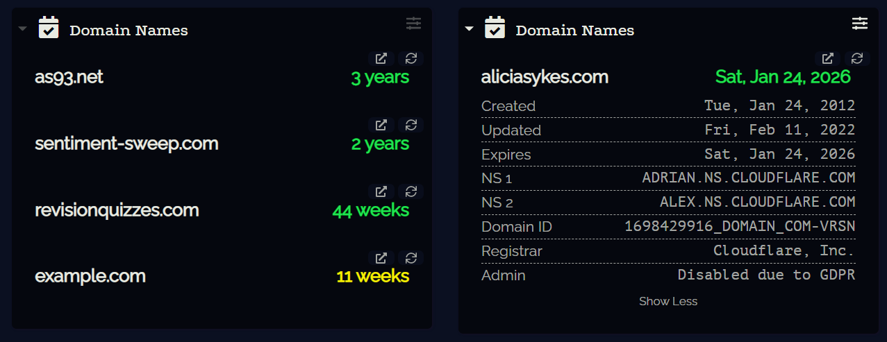 Dashy has support for displaying dynamic content in the form of widgets. There are several built-in widgets available out-of-the-box as well as support for custom widgets to display stats from almost any service with an API.