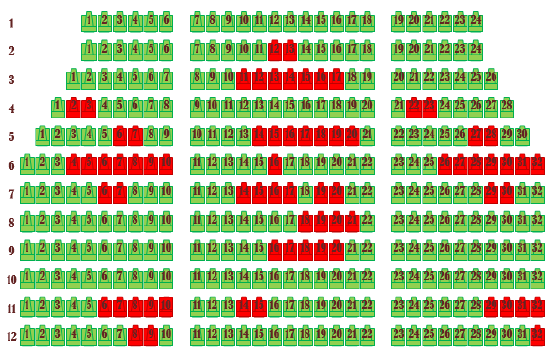 The seats in the screening hall are divided into three areas by two passages, with green indicating empty seats and red indicating occupied seats. Now we need to count the consecutive number and starting position of each empty seat segment, represented by row column numbers, such as 3-12 representing the 12th seat in the third row.