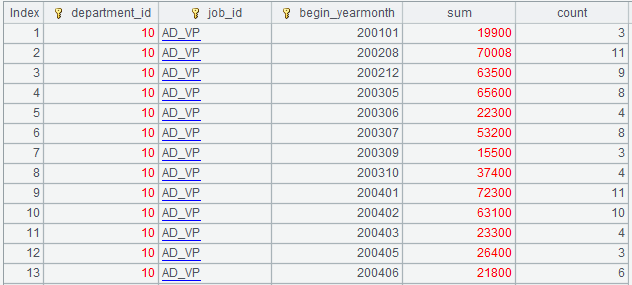 group by department_id,job_id, string(begin_date,'yyyyMM')